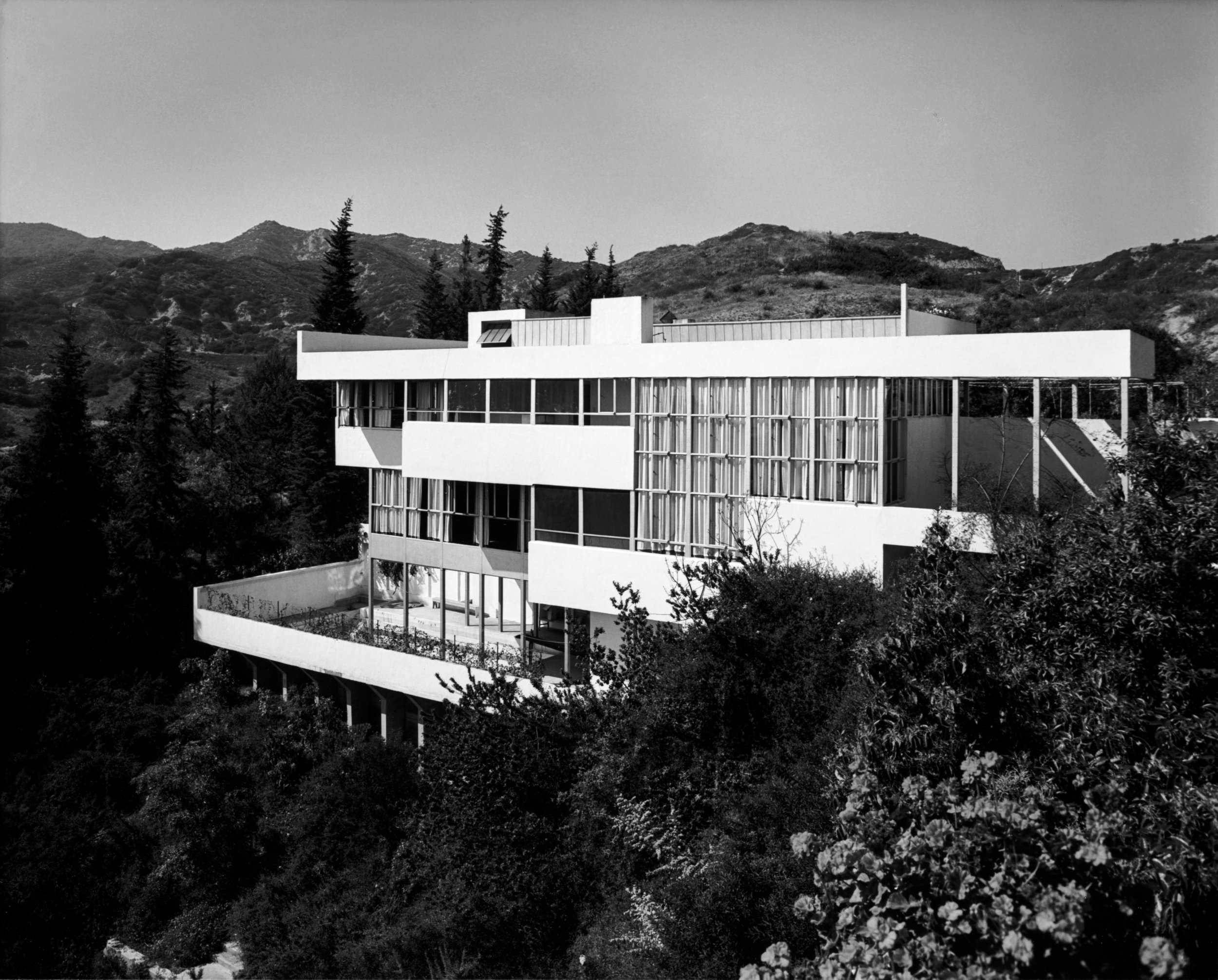 The Lovell Health House perched in the hills overlooking Los Angeles. Archival photo by Julius Shulman, J. Paul Getty Trust