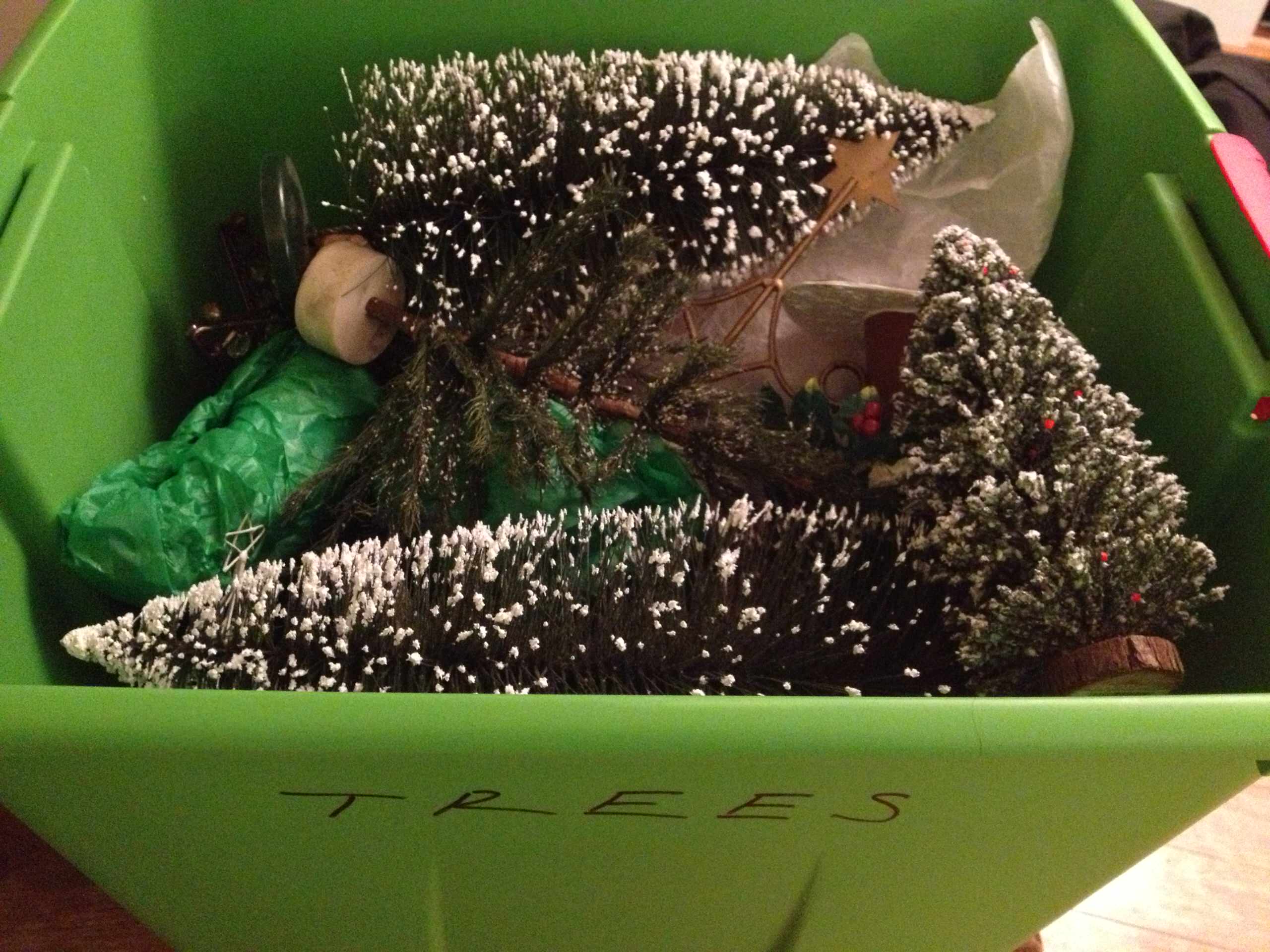 With the trees I set the large ones on the bottom and carefully stack the others. The glass or pottery trees I wrap in tissue and securely place in the middle.
