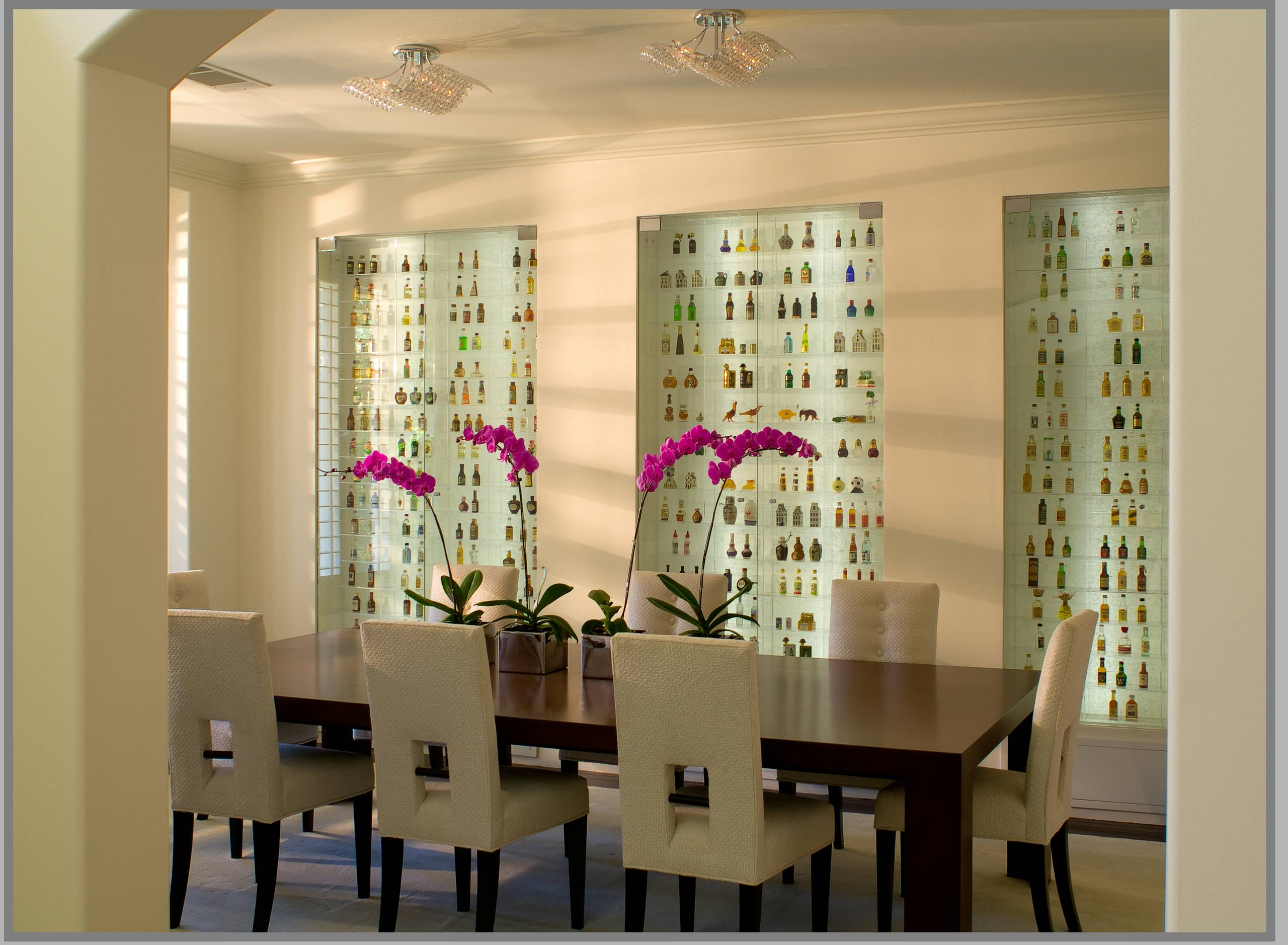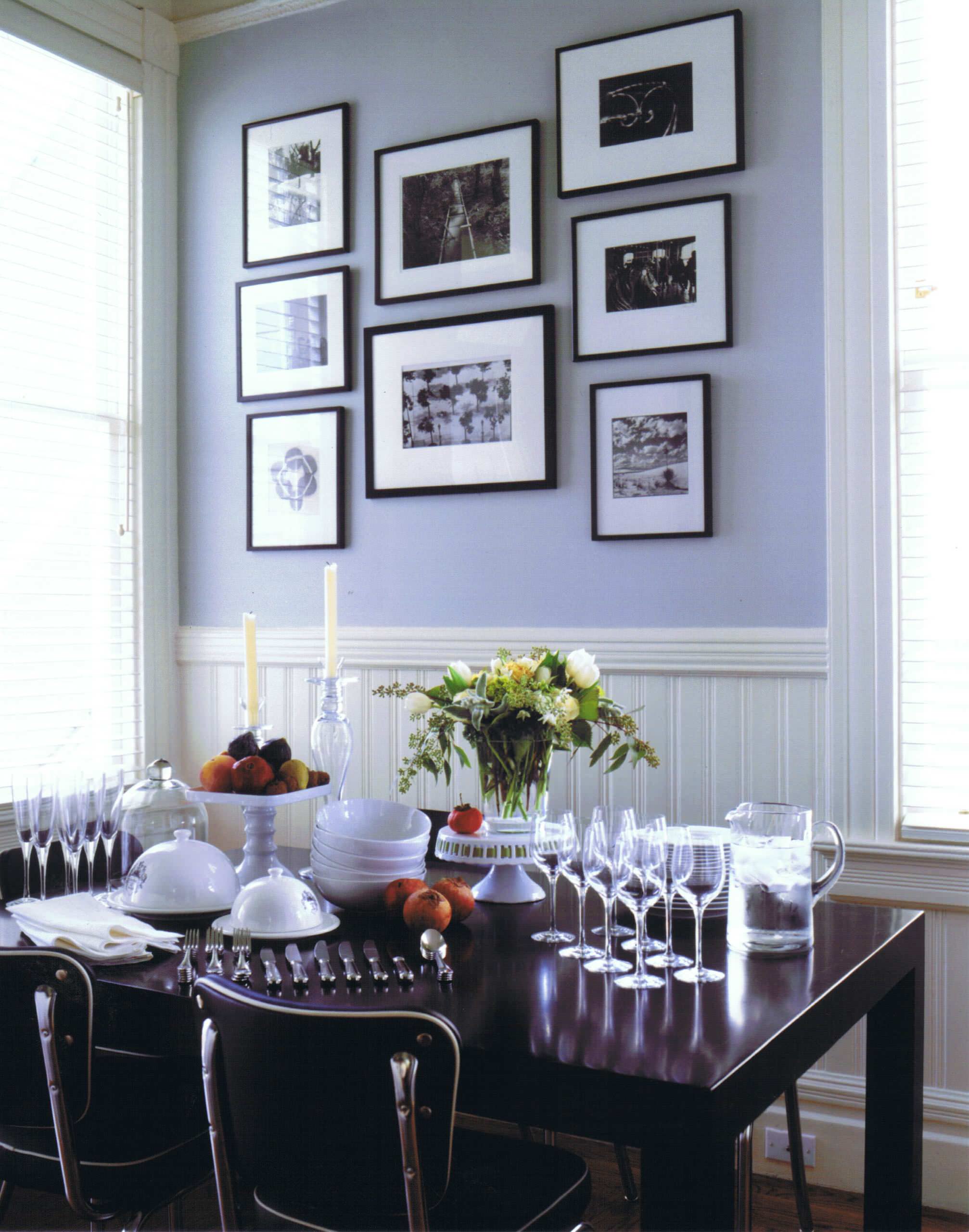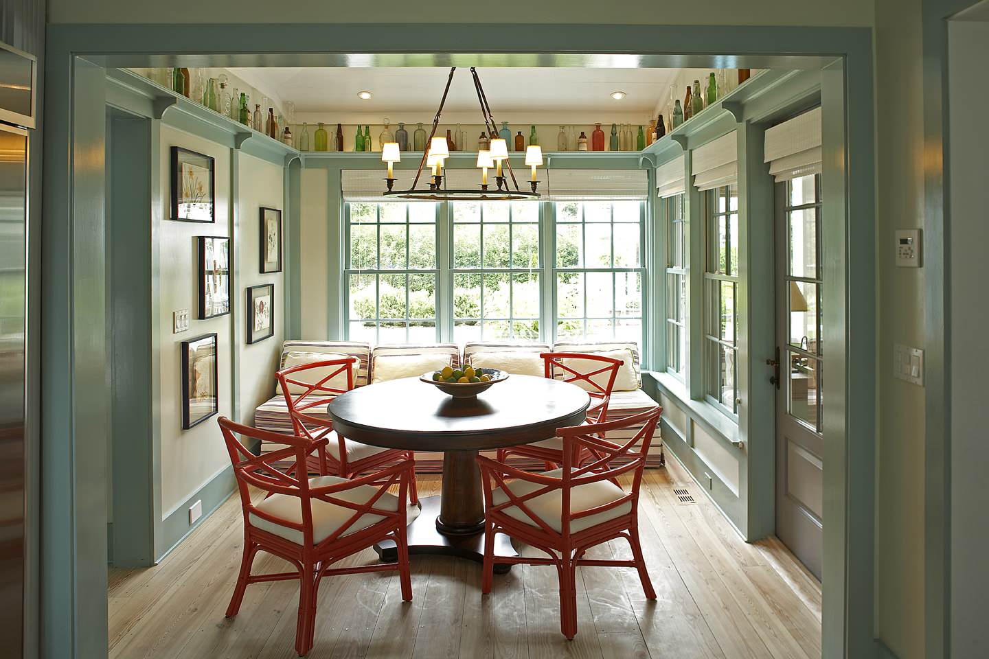 If you have a plate rail like the one in this lovely room, you have a ready-made place for your collectibles. I am particularly entranced by the way the wall color and the brightly colored chairs nod to the colors in the bottle collection.