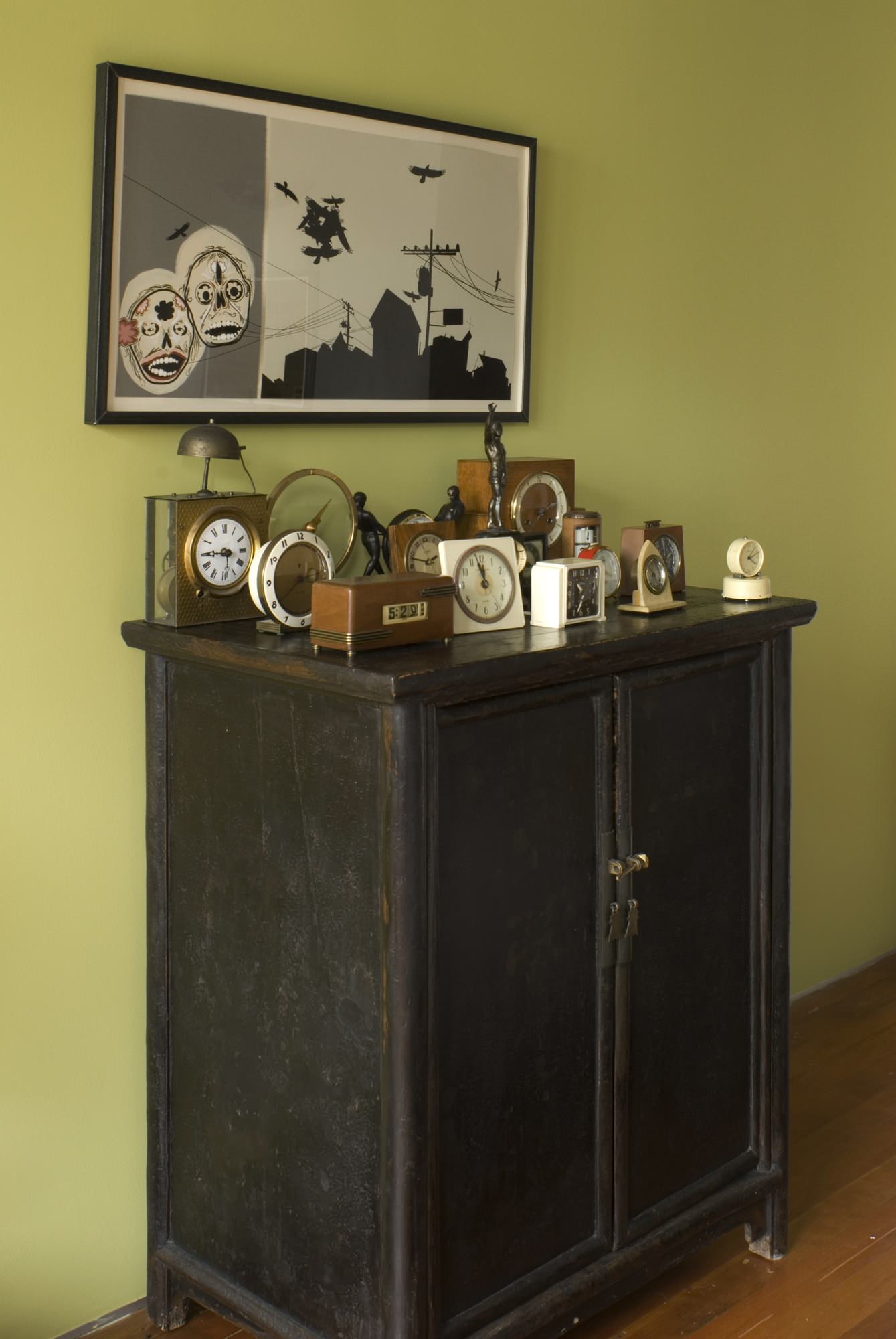Once again notice how wall color can bring life and interest to a collection. This group of clocks is arrayed on one surface, with that fabulous color behind them, rather than being spread across the room. This approach creates great impact and avoids a cluttered feel.