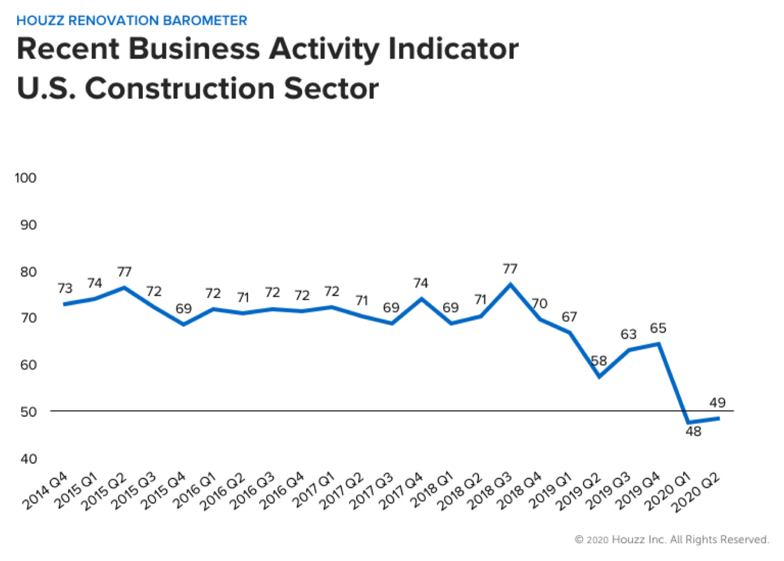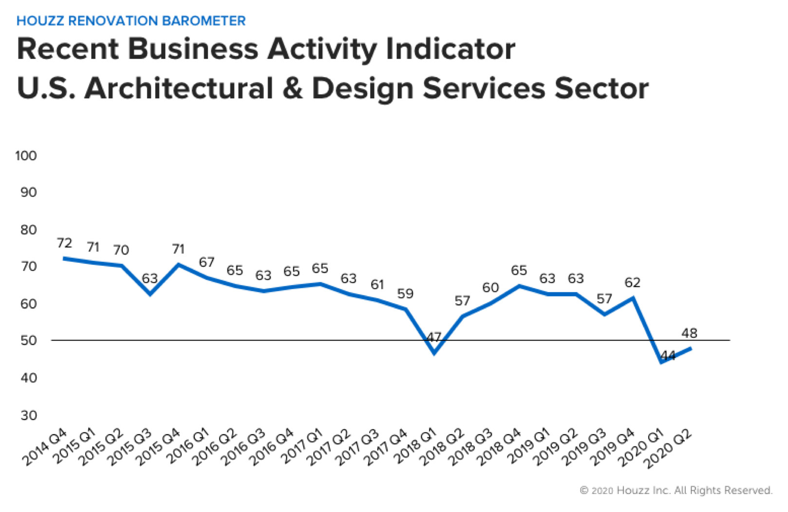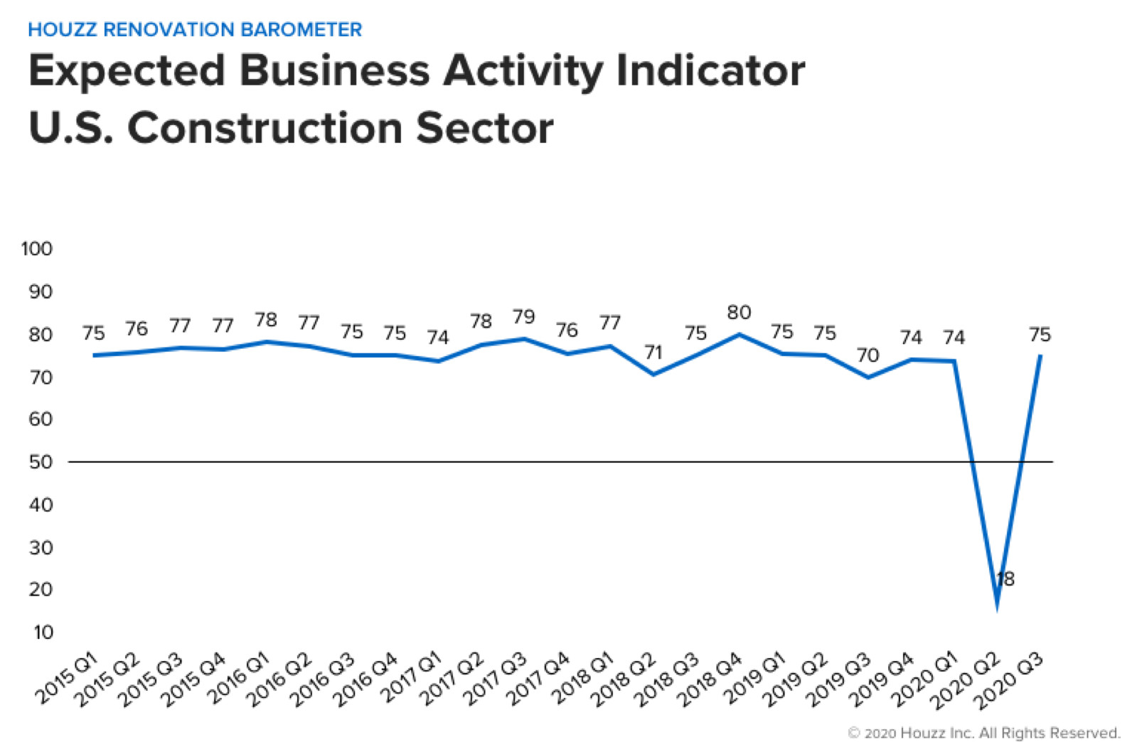 A score higher than 50 indicates that more firms reported increases than decreases in their business expectations. Q2 2020 marked the first time since the Houzz Barometer began in 2015 that scores fell below 50.