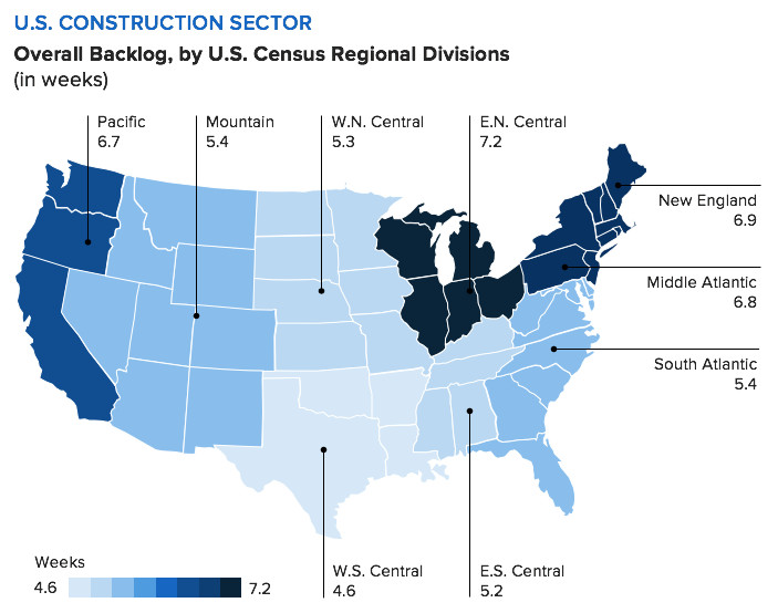 Of course, backlogs vary significantly by region, as this map shows. The West South Central division of the U.S. (Arkansas, Louisiana, Oklahoma, Texas) has the shortest average wait time (4.6 weeks), while the East North Central division (Illinois, Indiana, Michigan, Ohio, Wisconsin) has the longest (7.2 weeks) among the nine geographic divisions as defined by the U.S. Census.
