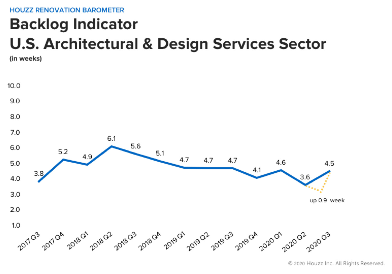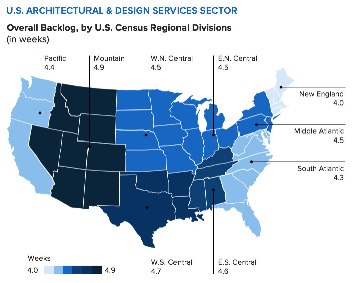 2. Wait times increased nationally. The Project Backlog Indicator for architectural and design firms rose to an average of 4.5 weeks nationally at the start of the third quarter of 2020, an increase of 0.9 week from the start of Q2 2020.
