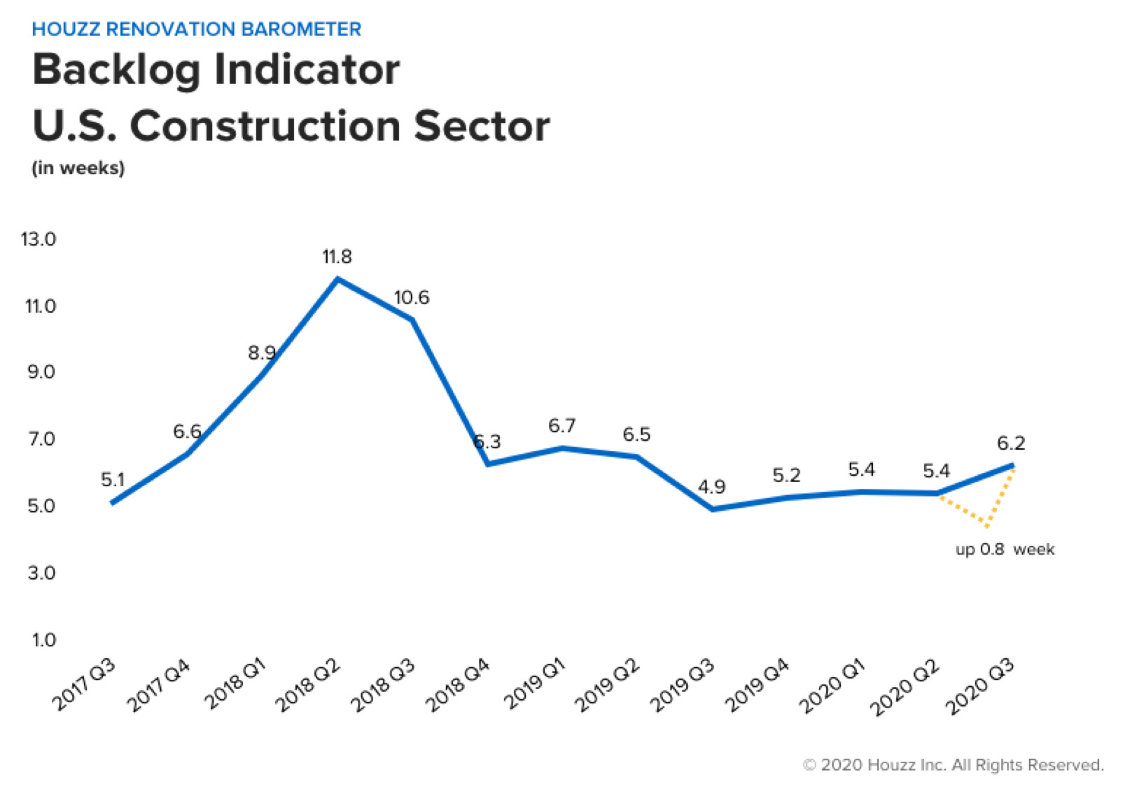 2. Project wait times rose nationally. Construction businesses that are focused on remodeling reported that wait times before they can take on a midsize project from a new client now average 6.2 weeks, up 0.8 week compared with the start of the previous quarter.