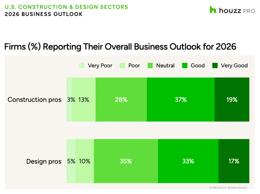 “Construction and design businesses are heading into 2026 with a measured but resilient outlook,” says Marine Sargsyan, head of economic research at Houzz. “While expectations for the broader national economy remain subdued, and cost and labor pressures persist, many firms anticipate stable demand for their projects. To drive revenue growth in 2026, businesses are adjusting their strategies by raising prices, prioritizing larger and higher-value projects and investing in employee productivity, reflecting broader industry interest around AI-enabled software tools such as Houzz Pro.”