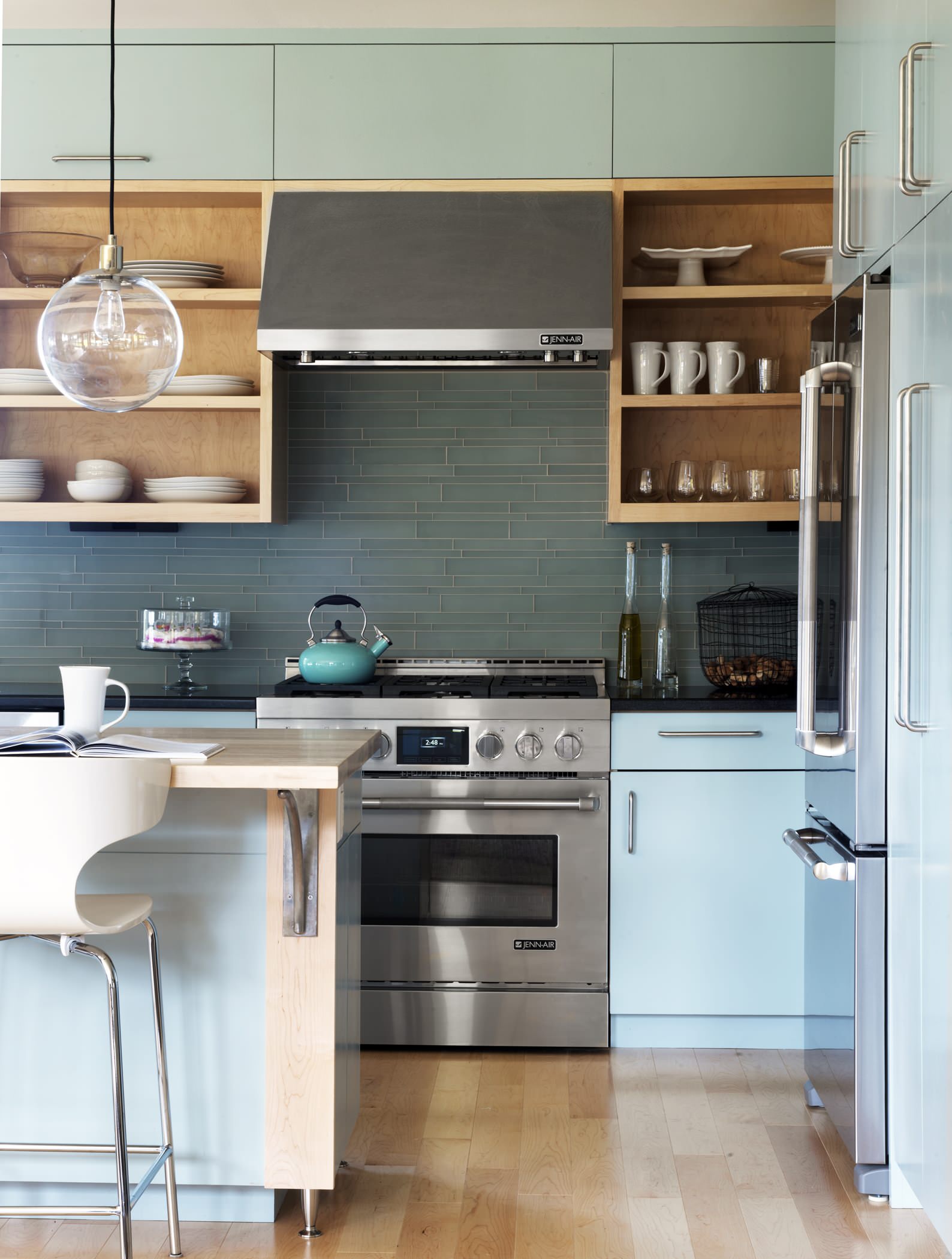 4. Counter height. Different people and tasks require different counter heights. If custom cabinets are not in your budget, one way to vary the finished height of the counter is to use materials of different thicknesses set on standard cabinets. A standard kitchen counter is 36 inches off the floor, but if you have someone tall in your family, 39 inches may be a more comfortable height. Here, a butcher block set lower than adjacent tops gives the person chopping more leverage.