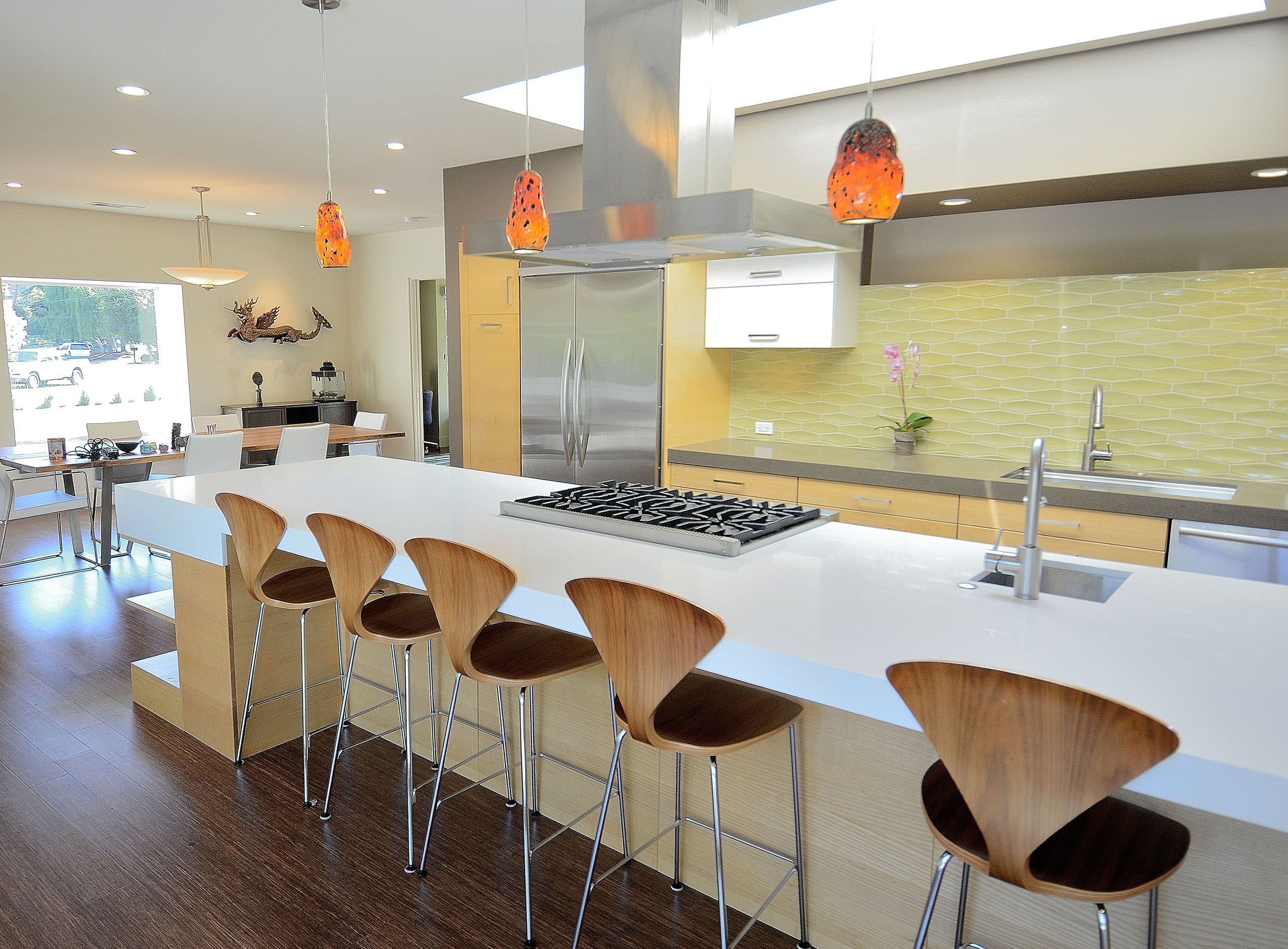 This yellow resin countertop sure makes a bold statement and draws your eye right to the cool, linear sink. The remainder of the colors used are light or neutral, allowing the countertop, sink and onyx backsplash behind the range to really stand out.