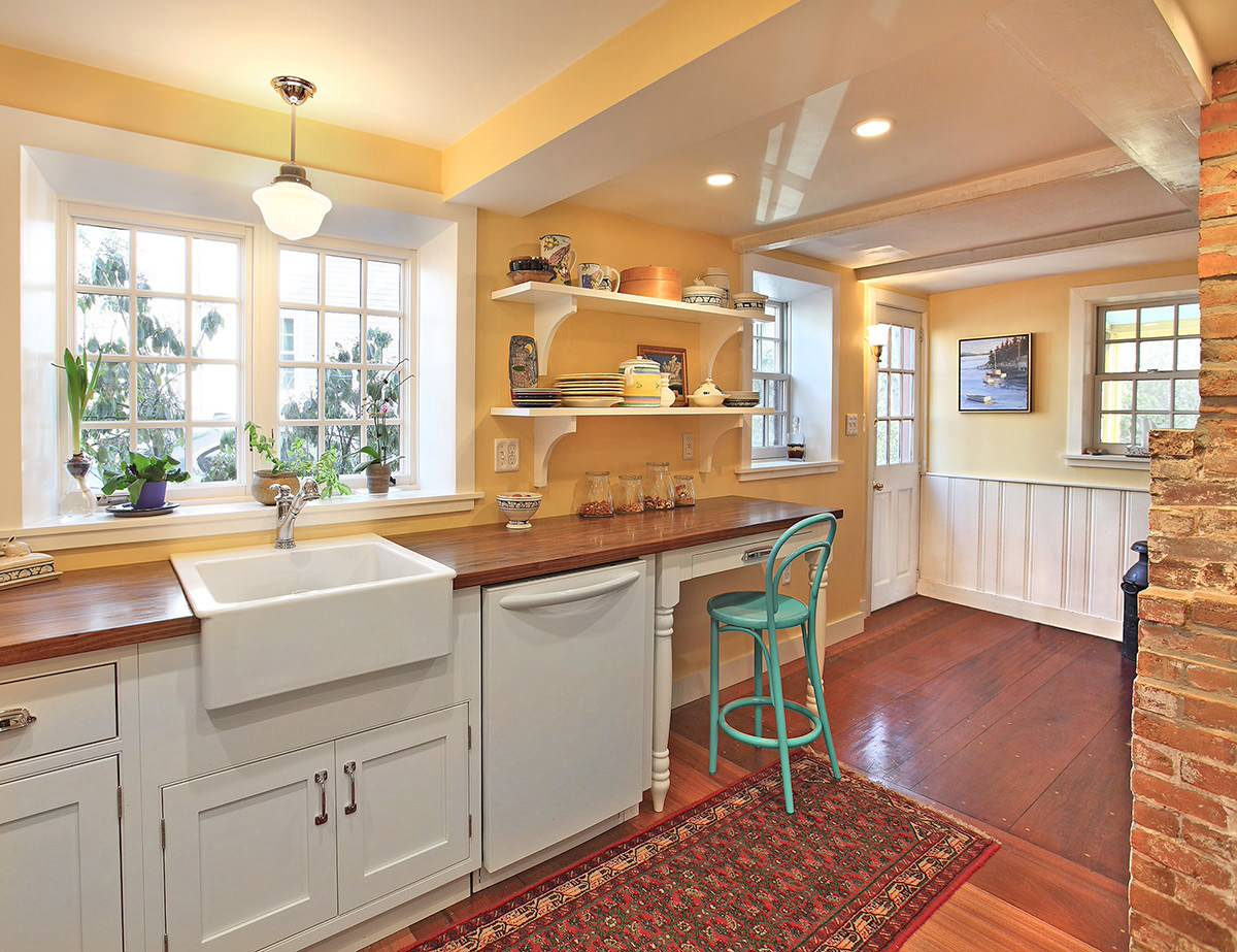 This cozy kitchen has a warm and inviting shade of yellow on the walls. Combined with the warm wood and brick tones and the clean white cabinetry, it's a pleasing kitchen palette.