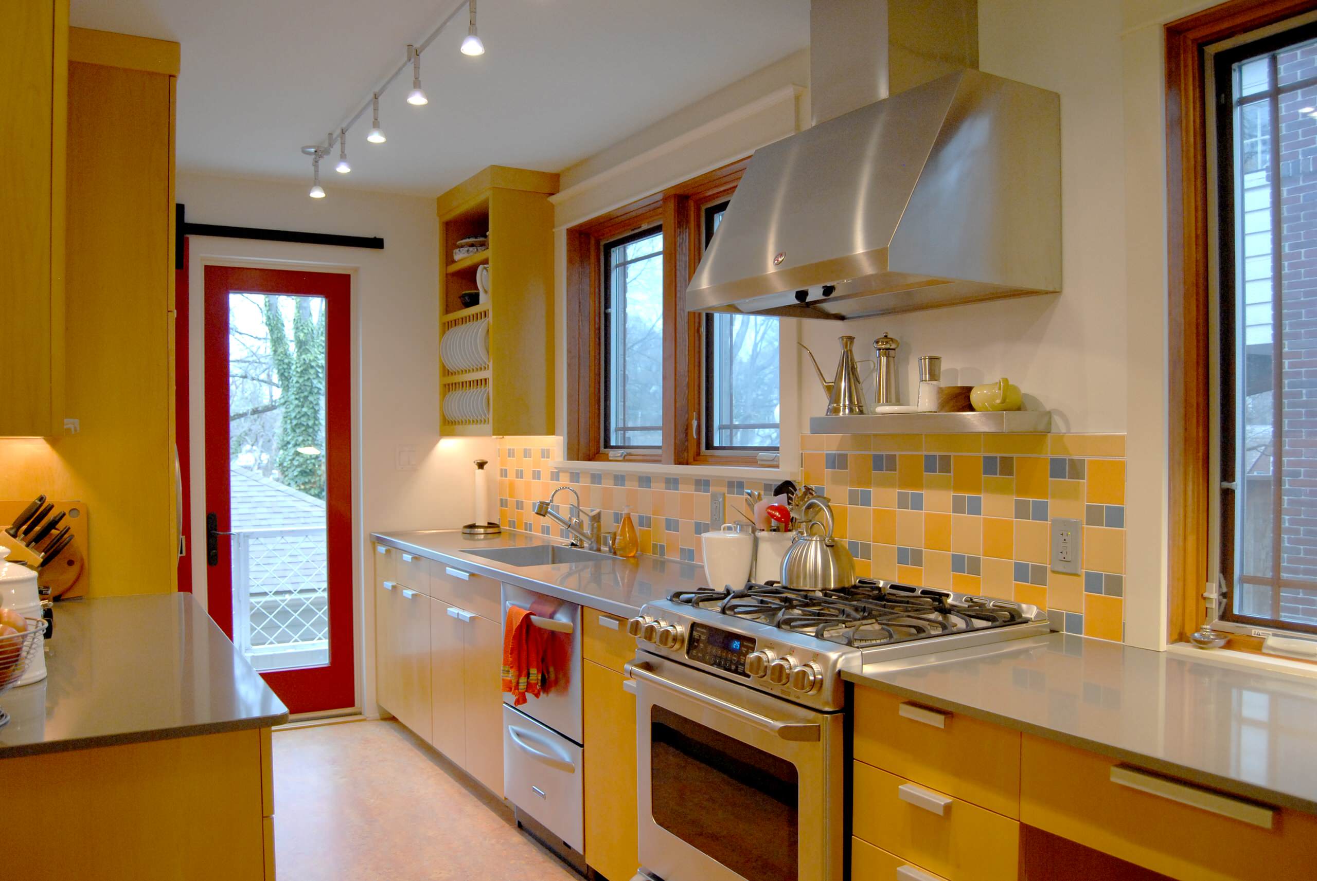 Yellow looks modern in this contemporary stunner. The bold yellow cabinetry is balanced nicely by the light wood floor and darker wood-clad exposed ceiling. The stainless steel appliances add a cool sheen to the mix.