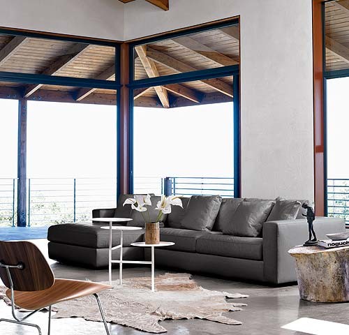 Here's another look at that exact same cowhide table. Here we see how it can be paired with leather and wood decor to create a very solid masculine look for the home.