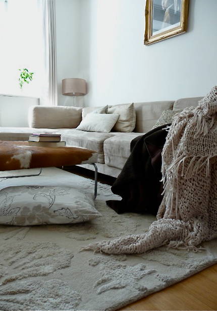 The cowhide rug is the most common place that cowhide is used in the home. I love the way it's paired with the equally bold nature patterned wall to create a space that is unlike any other.