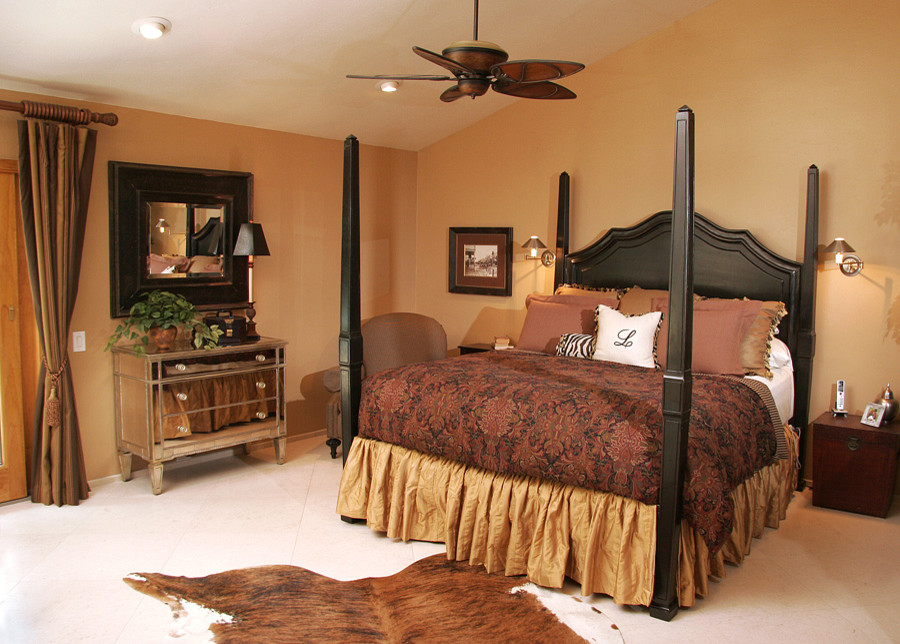 Here's a great example of how a brown and white cowhide rug can be a really rich addition to a totally lush room. This bedroom is done in browns and golds so that you notice the colors of the rug more than any type of print.