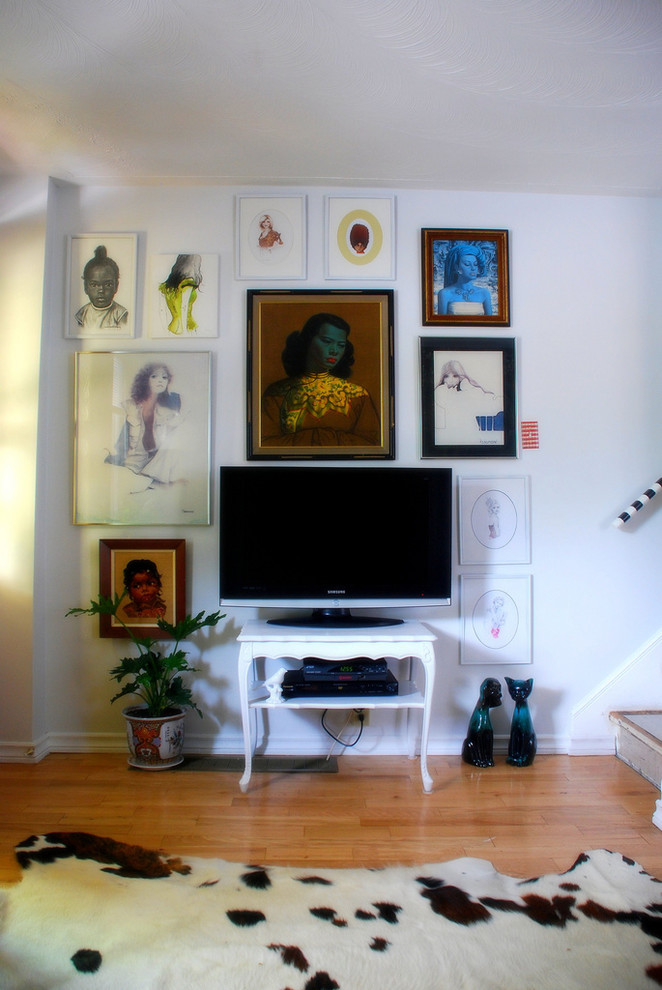 This is a great example of how the cowhide rug can complement the most eclectic of rooms. It's an interesting pattern but a fairly simplistic one so it doesn't compete with the rest of the attention-getting decor.