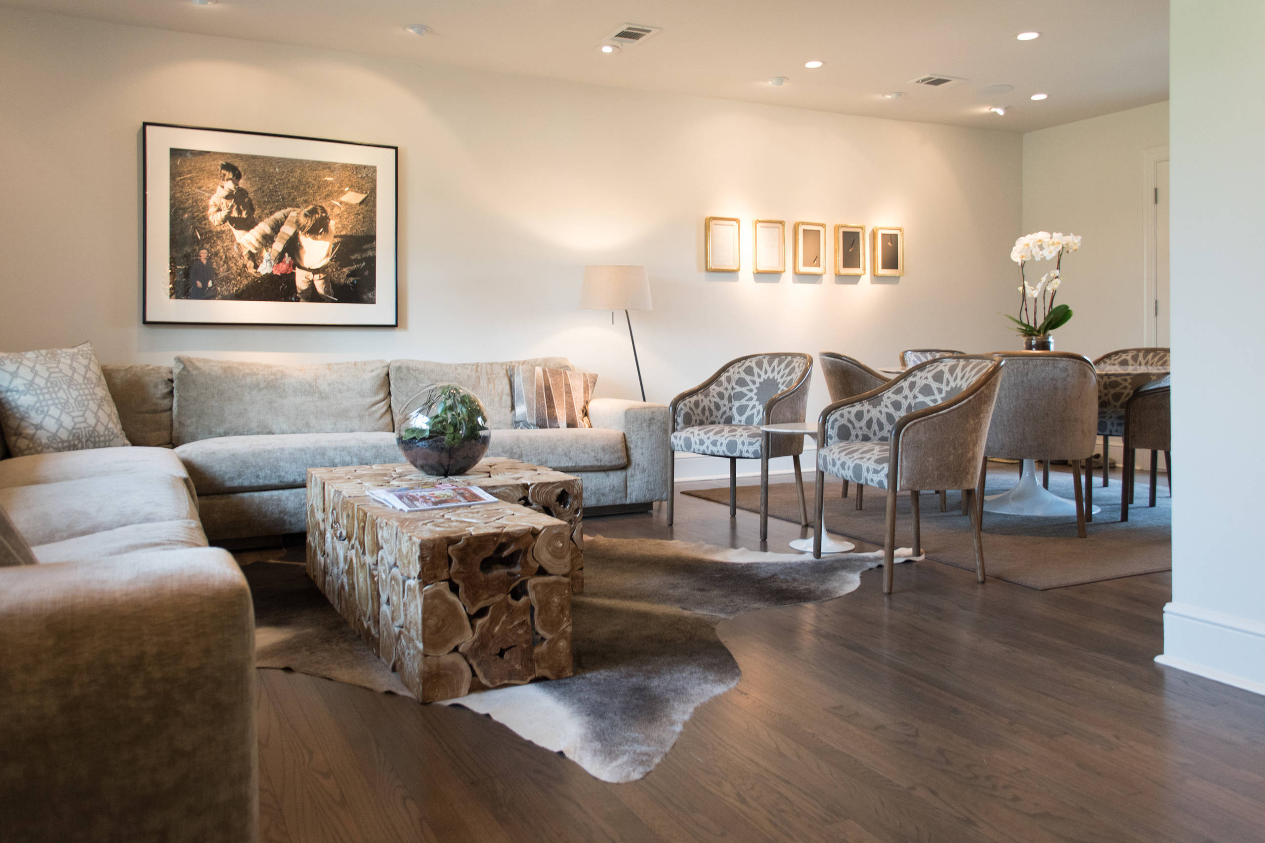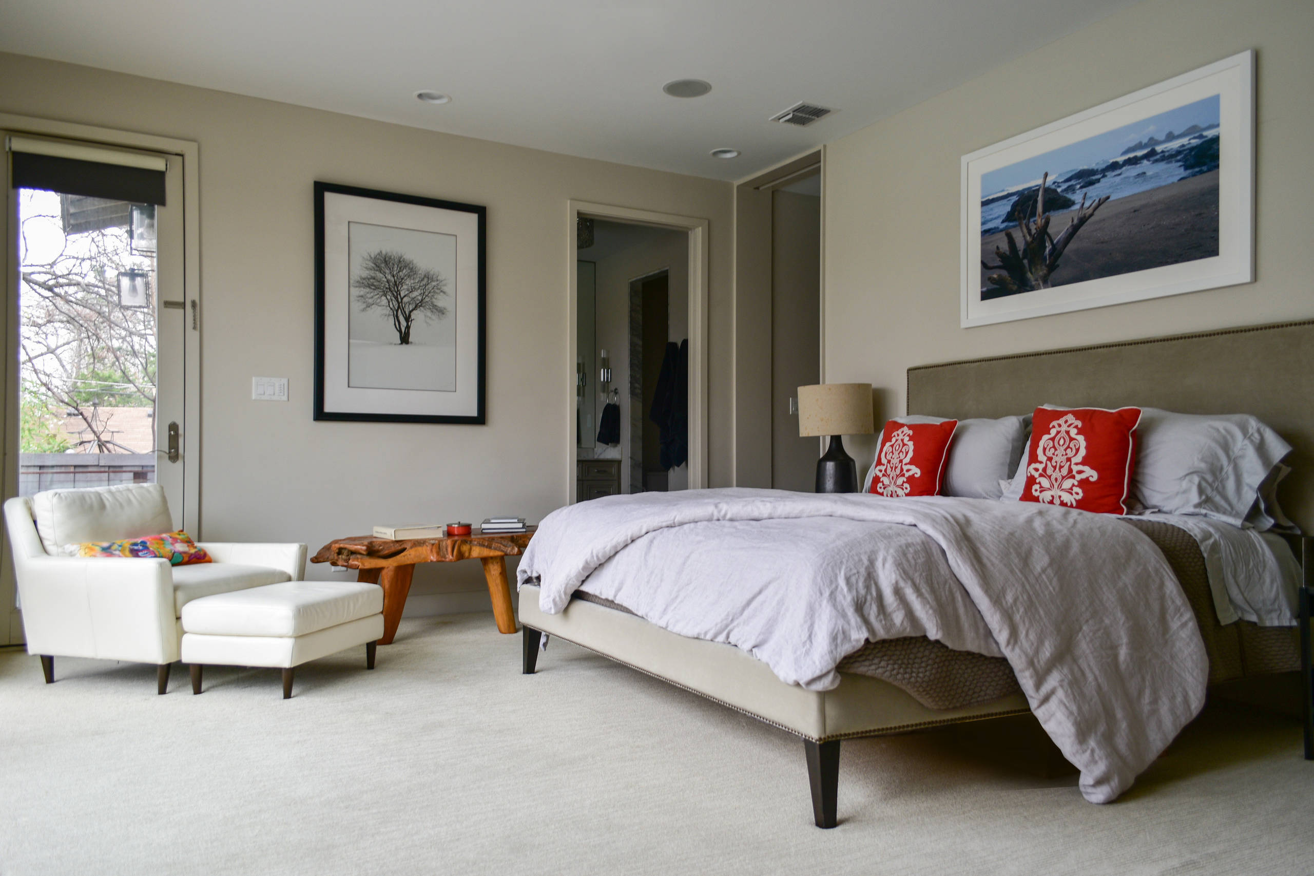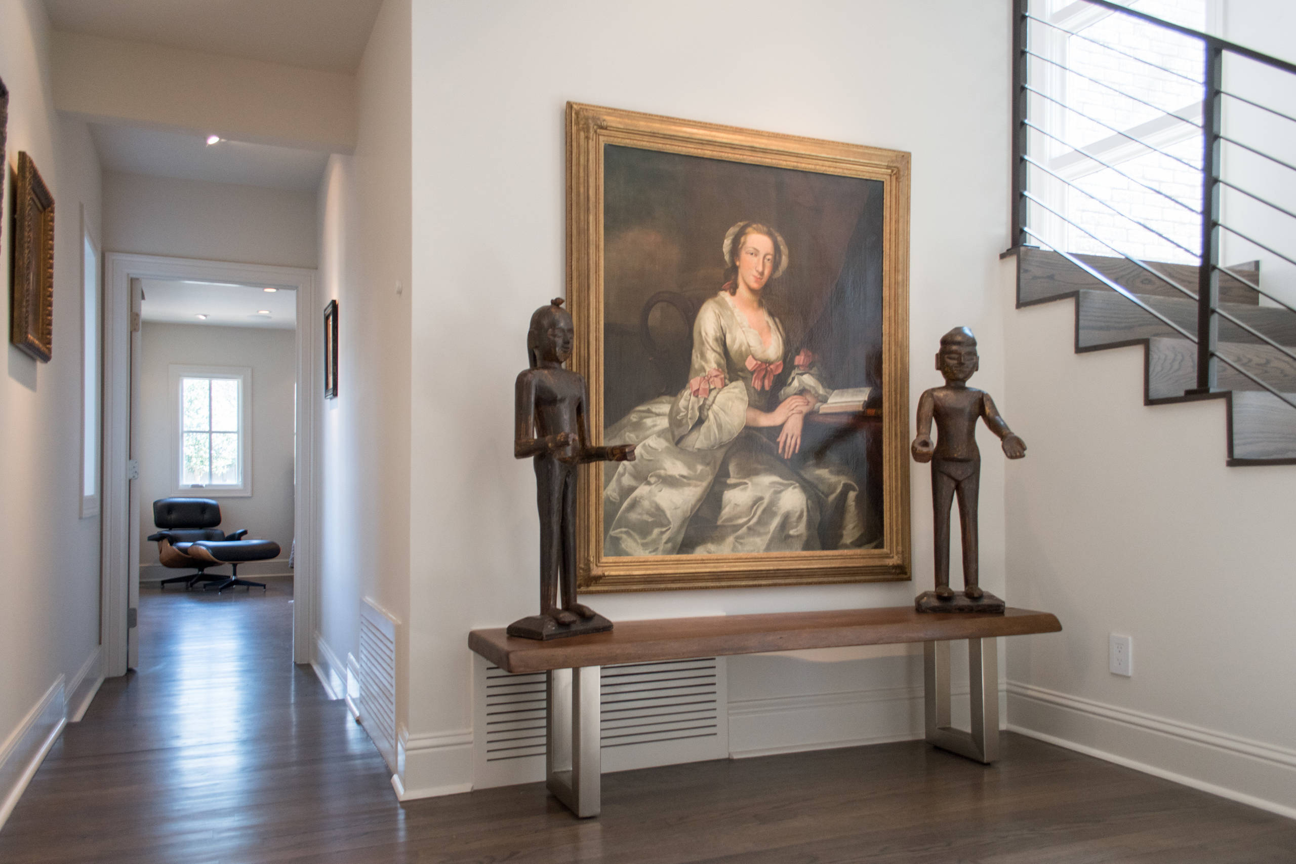 The updated home includes wood floors throughout. It’s furnished with a mix of midcentury and contemporary pieces, and the walls are decorated with fine art.