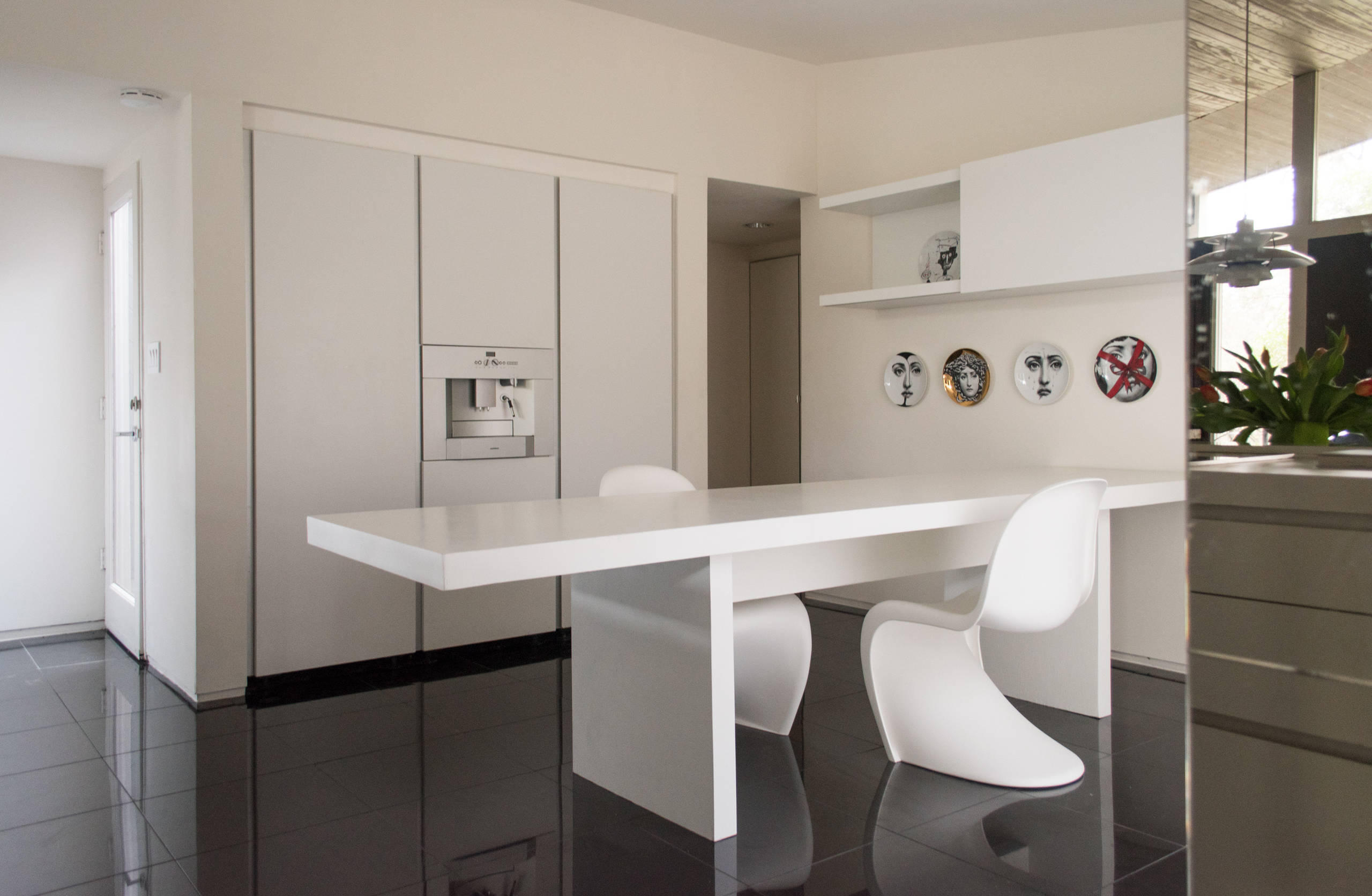 “The kitchen is German Bulthaup,” Paduch says. “All of the appliances are Miele, and everything is hidden.” Black granite flooring provides contrast and depth in the all-white kitchen.