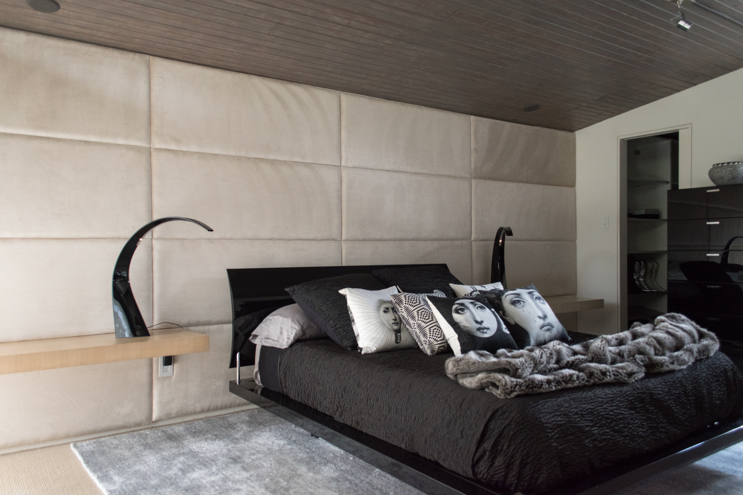 Photography of her favorite musicians and works by Piero Fornasetti, including these throw pillows, complement the sleek interior.