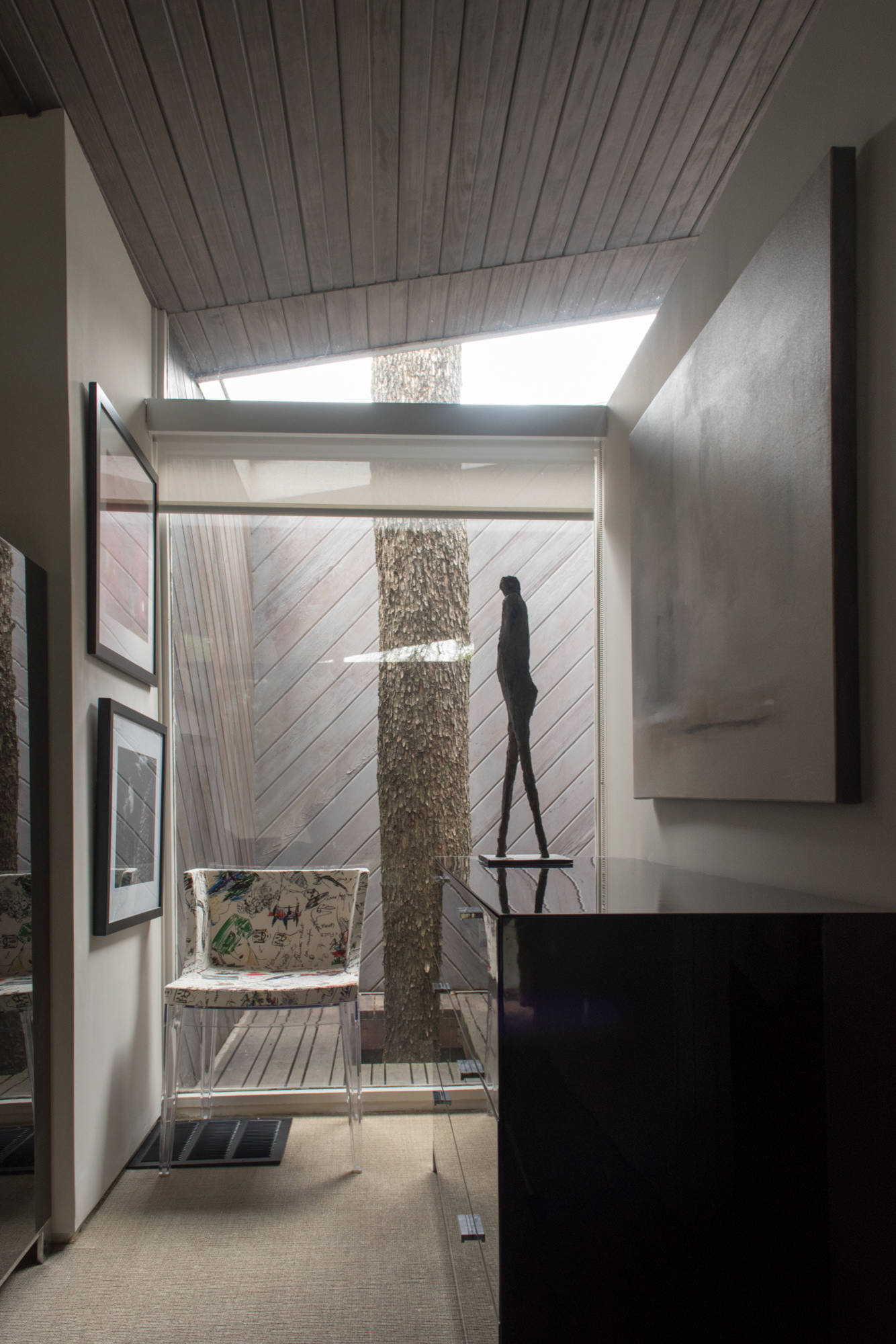 Architect Lewis Thomas built the home and created this atrium to surround an existing tree on the property. “I would like to meet the person who didn’t cut down one tree,” Paduch says. “It’s very peaceful. This is my view in the morning.” ♦︎