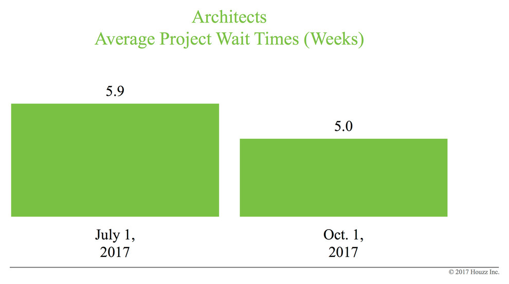 Architects reported wait times of five weeks, down from 5.9 weeks in July. This industry group was most able to shorten wait times, compared with the rest of the groups that Houzz tracks.