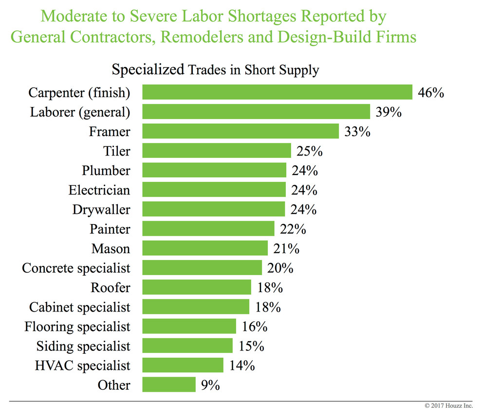 Why are some project wait times longer now? There are many contributing factors to backlogs across the country, but a major one is a lack of workers, according to the latest Houzz Renovation Barometer report, fielded from Sept. 28 to Oct. 12, 2017. This continues a pattern. Residential construction and renovation firms have been facing labor shortages for years, even as the demand for remodeling services has risen.