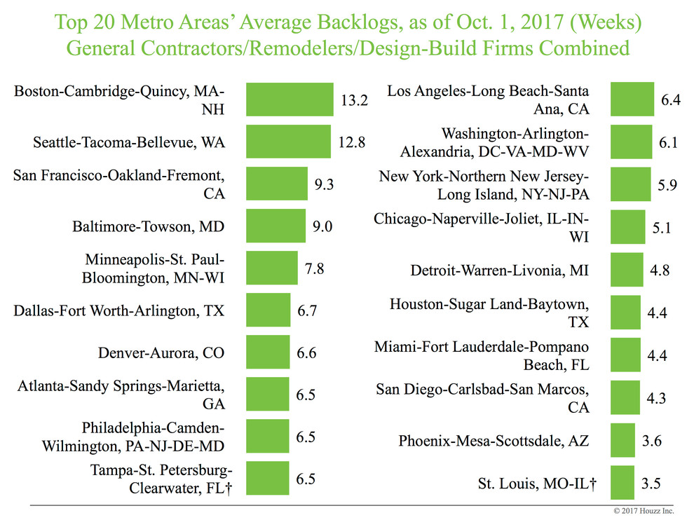 Houzz research finds average project wait times ranging from 3.5 weeks in St. Louis to 13.2 weeks in Boston