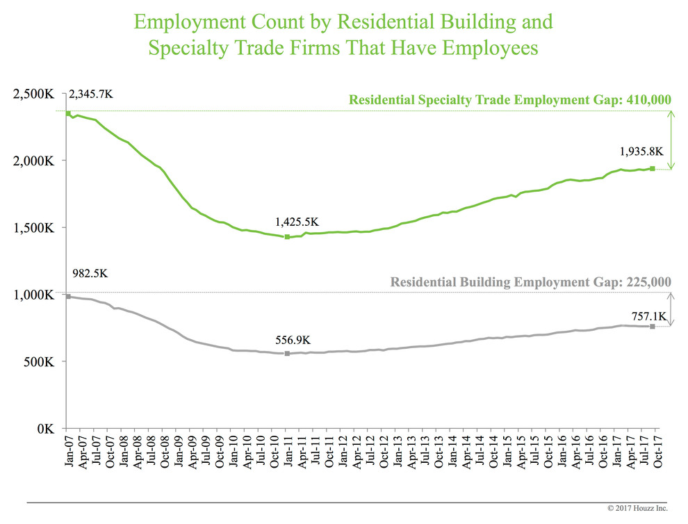 Houzz’s findings underscore other economic data. The Bureau of Labor Statistics regularly tracks how the U.S. job market is doing. Since the recession, the residential building and residential specialty trade numbers have simply not bounced back. We are still about 635,000 workers fewer than we were in January 2007. The residential building and specialty trade industry gained 27,000 employees so far in 2017, yet hiring slowed during the third quarter of this year. And that’s just employment at firms — sole proprietorships, like an electrician or plumber operating his or her own business, are not reflected in this count.