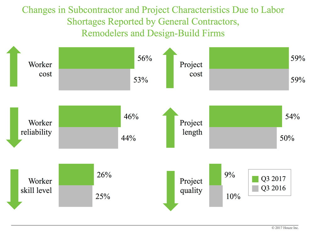 Labor shortages worsen compared with the previous three months. The home renovation industry has been dealing with a shortage of workers since the 2008 financial crash, but firms reported a slight worsening of this problem during the third quarter (July, August and September 2017) compared with the previous three months. Seventy-eight percent of general contractor, design-build and remodeling firms say they are experiencing moderate to severe labor shortages.