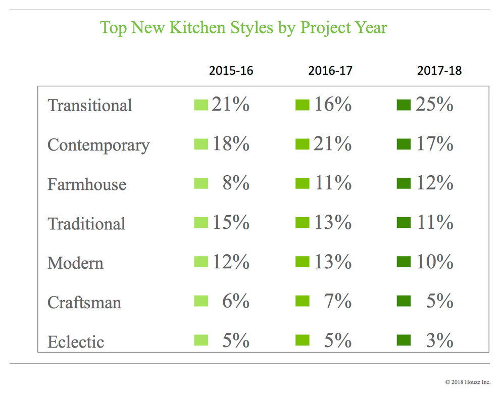 Shift in style. A kitchen renovation is a great opportunity to change the style of your kitchen, and 87 percent of homeowners who renovated chose a style makeover. The most popular style was transitional, followed by contemporary and farmhouse. That’s a shift from two years ago, when traditional style held the No. 3 slot.