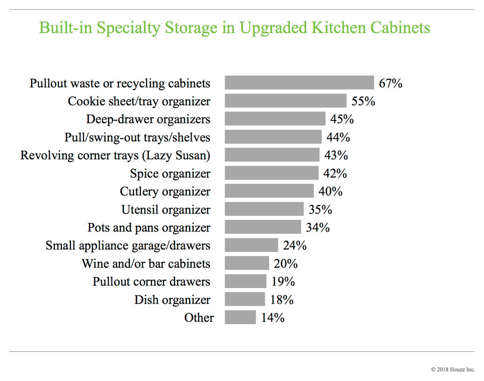 People like to corral their cookie sheets. Given that storage was a priority for so many, it isn’t surprising that many of those who upgraded their cabinets chose to include built-in storage. The most popular choices were pullout waste or recycling cabinets (67 percent), followed by cookie sheet or tray organizers (55 percent) and deep-drawer organizers (45 percent).