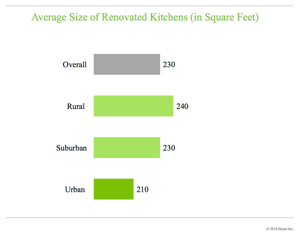 Size. Overall, the average size of a renovated kitchen was 230 square feet, the study found, but size varies by location. Owners of urban homes reported the smallest kitchens (210 square feet, on average), while owners of rural homes reported the largest (240 square feet). More homeowners (40 percent) reported increasing the size of their kitchens during renovation than did homeowners in the surveys for 2015-16 (36 percent) and 2016-17 (37 percent).