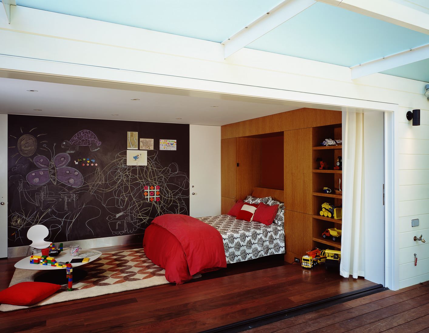 The black floors, red built-in and chalkboard wall add up to playful drama in this space!