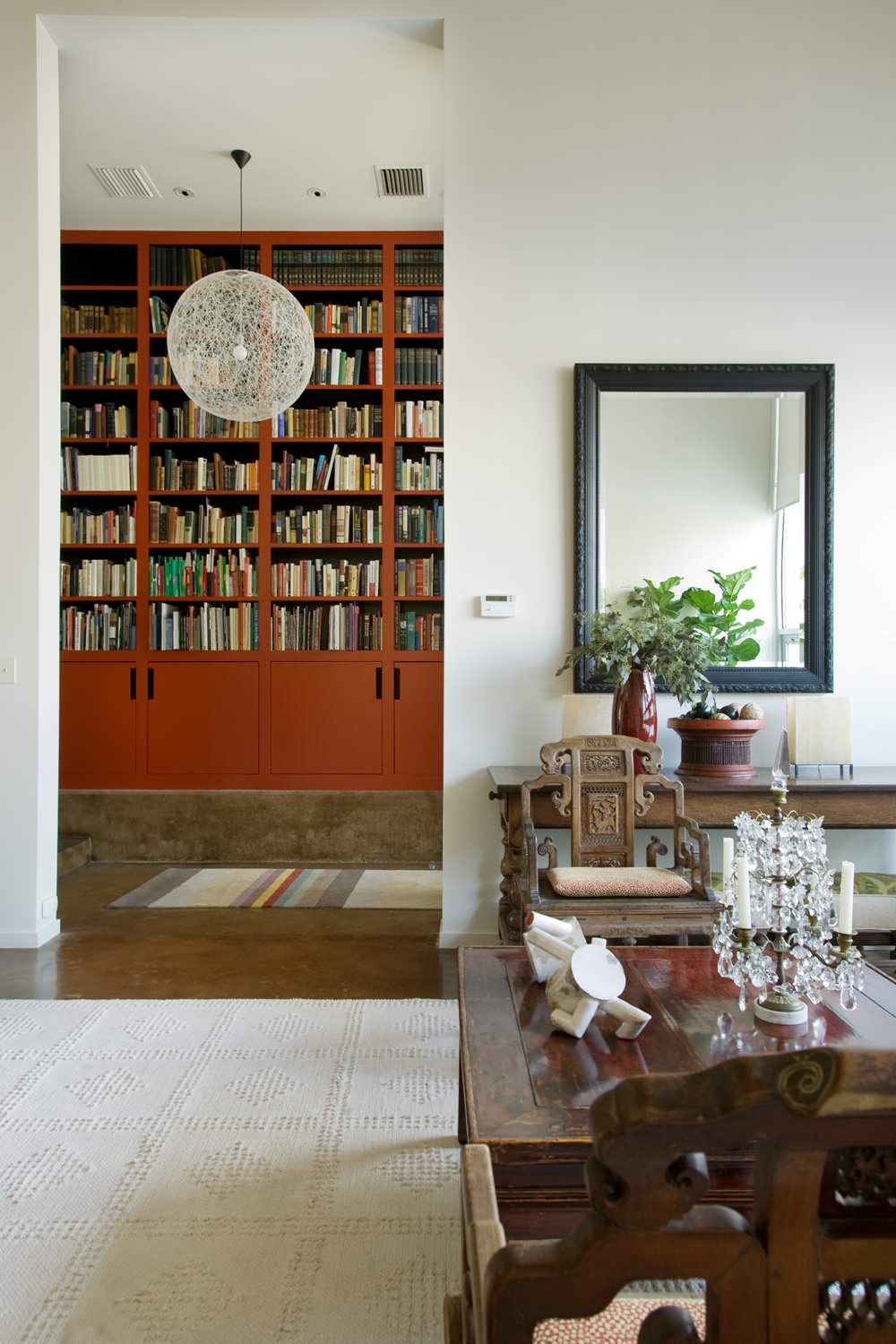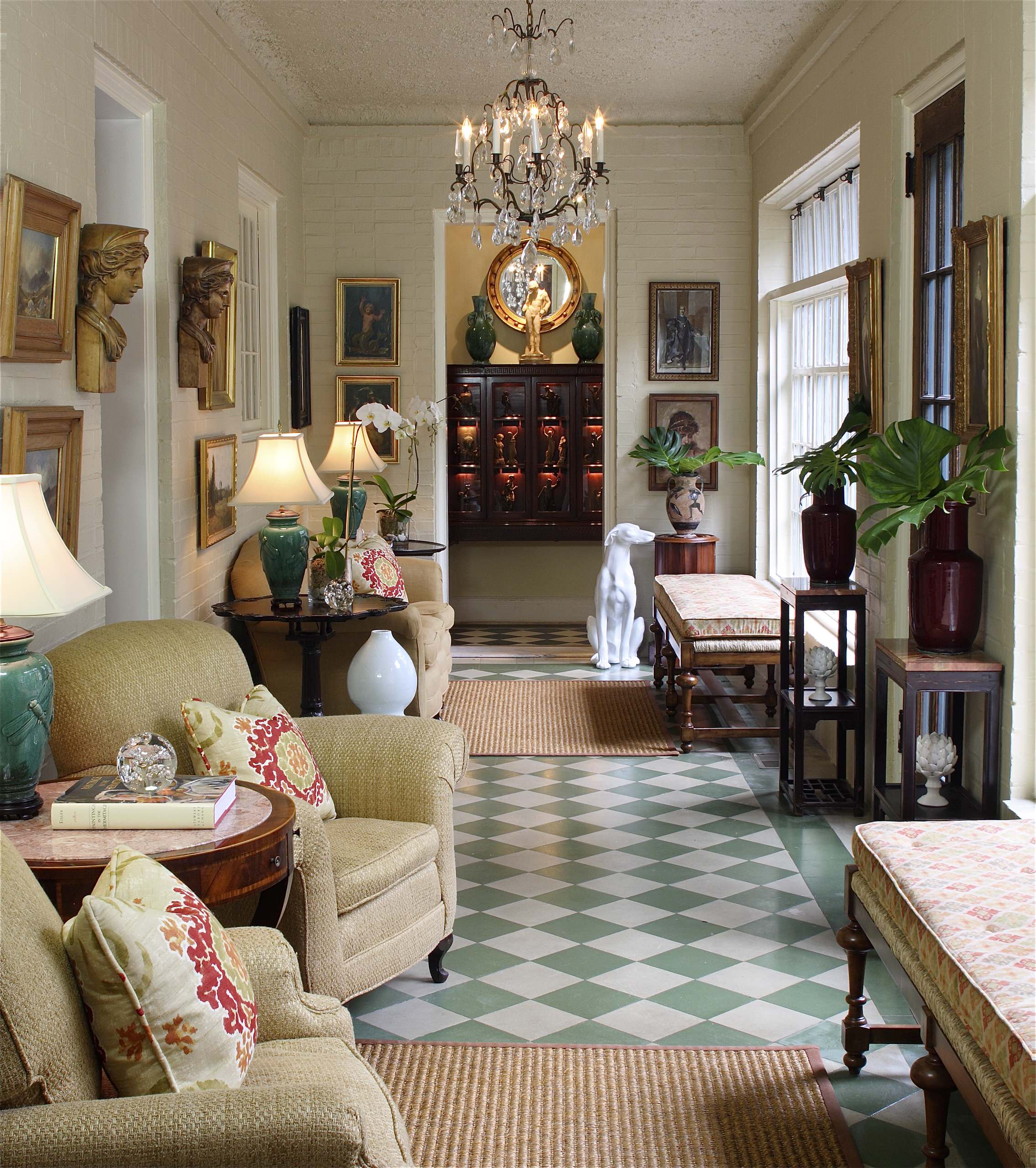 I’ve never owned a girandole but have always wanted one. They are beautiful at night on a side table or even a dining table when used with candles or very dim electric bulbs. As you can see here, where the girandole has been mixed very creatively with Asian furniture, they are really the world’s most elegant candlestick. Their prismatic crystals reflect light in a unique way, really establishing a romantic ambience. If you’ve ever seen the movie The Scarlet Pimpernel, you’ll know exactly what I mean.