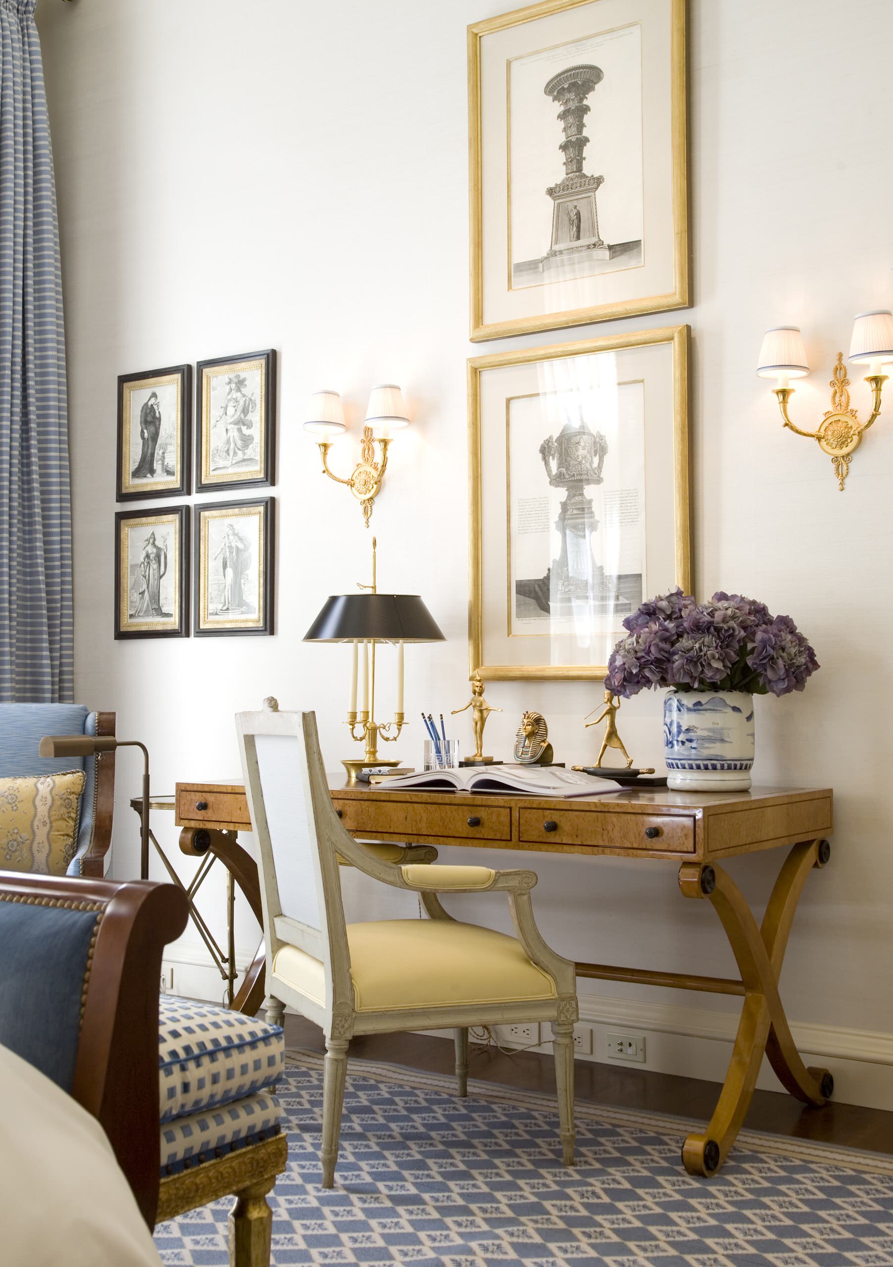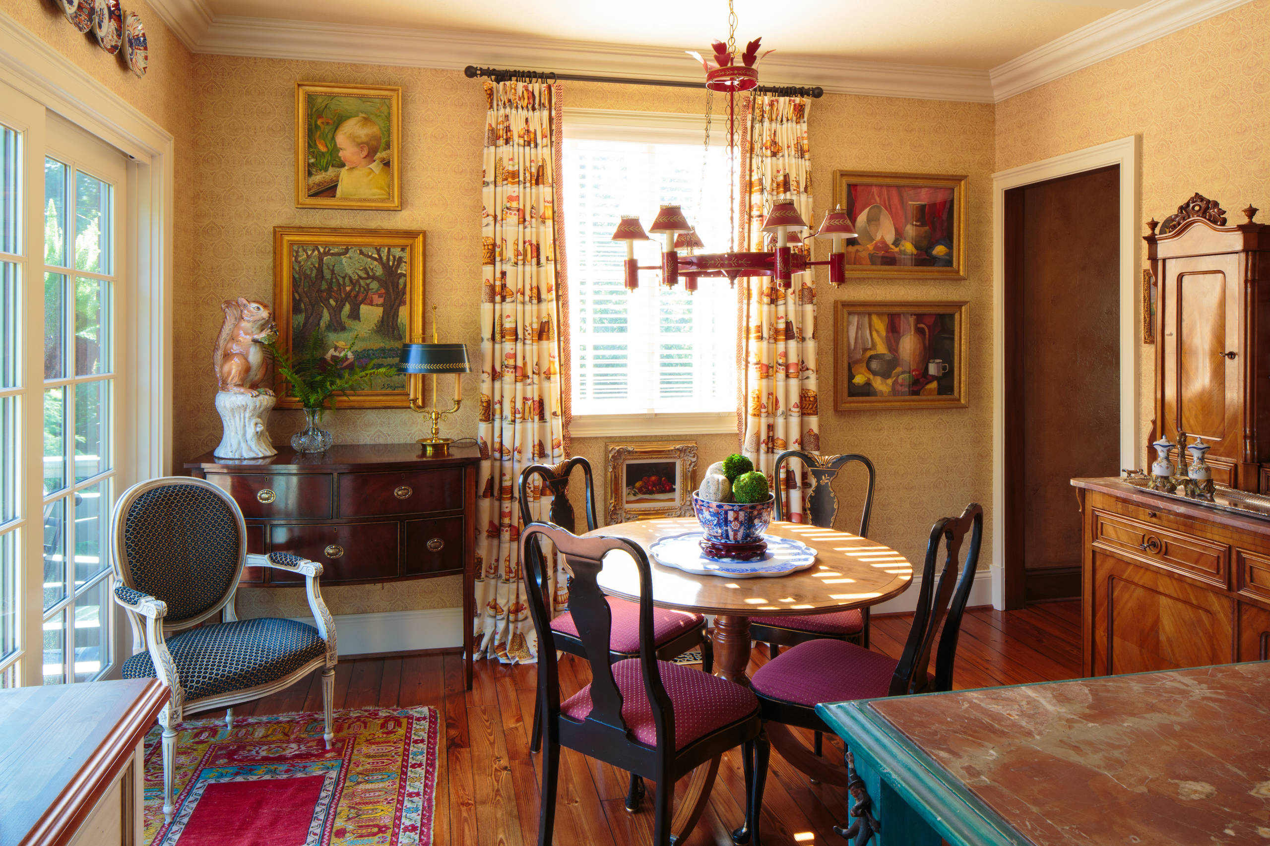 Here a bouillotte lamp sits on a small buffet and works charmingly with a red tole chandelier in a breakfast area. Again, antique lighting plays an important role in staging a well-designed room intended to summon a bygone era.