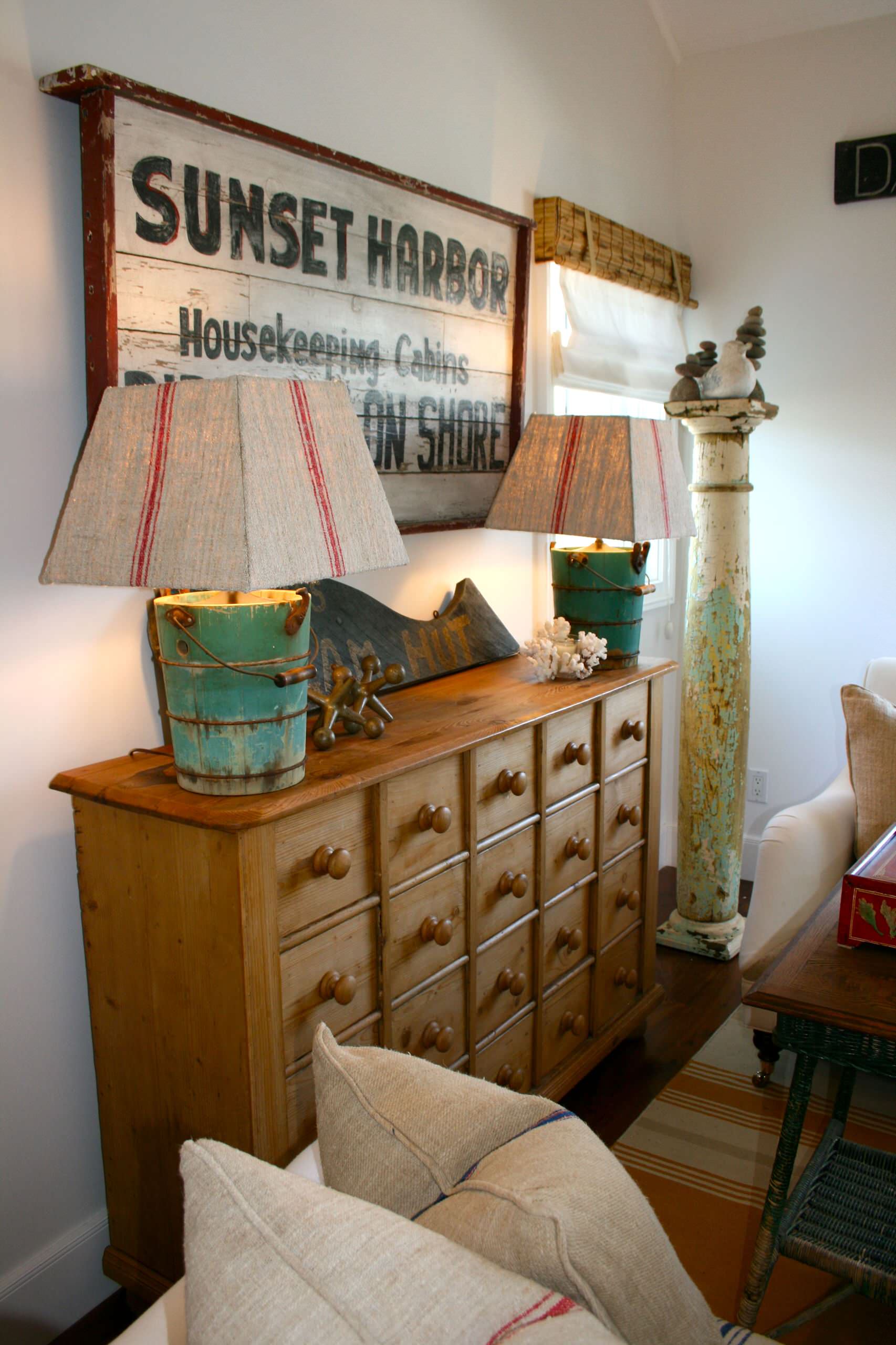 Antique lighting can also come in the form of any antique object that lends itself to becoming a lamp. In this case old homemade ice cream churns have been artfully turned into table lamps. What a great sense of country charm they produce in this comfortably inviting farmhouse-style family room.