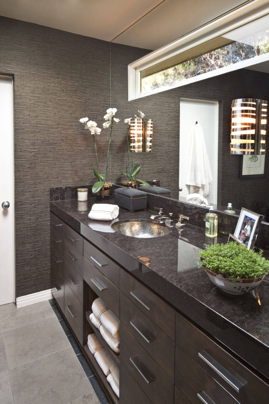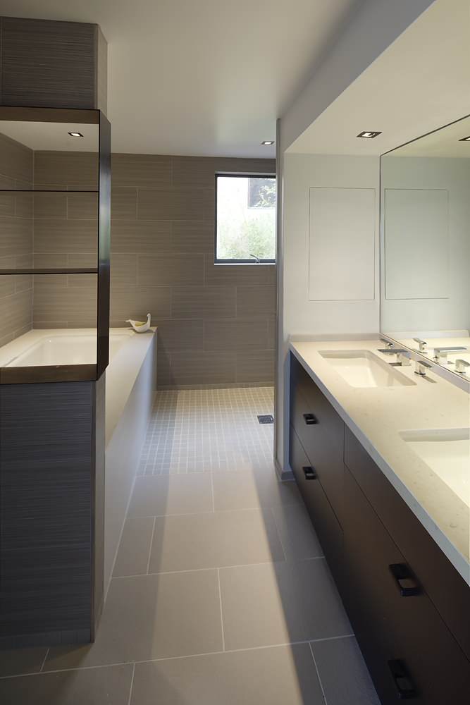 Caesarstone was used for the brown walls and countertop in this bathroom. You can use it all by itself or in combination with tile to beautiful effect.