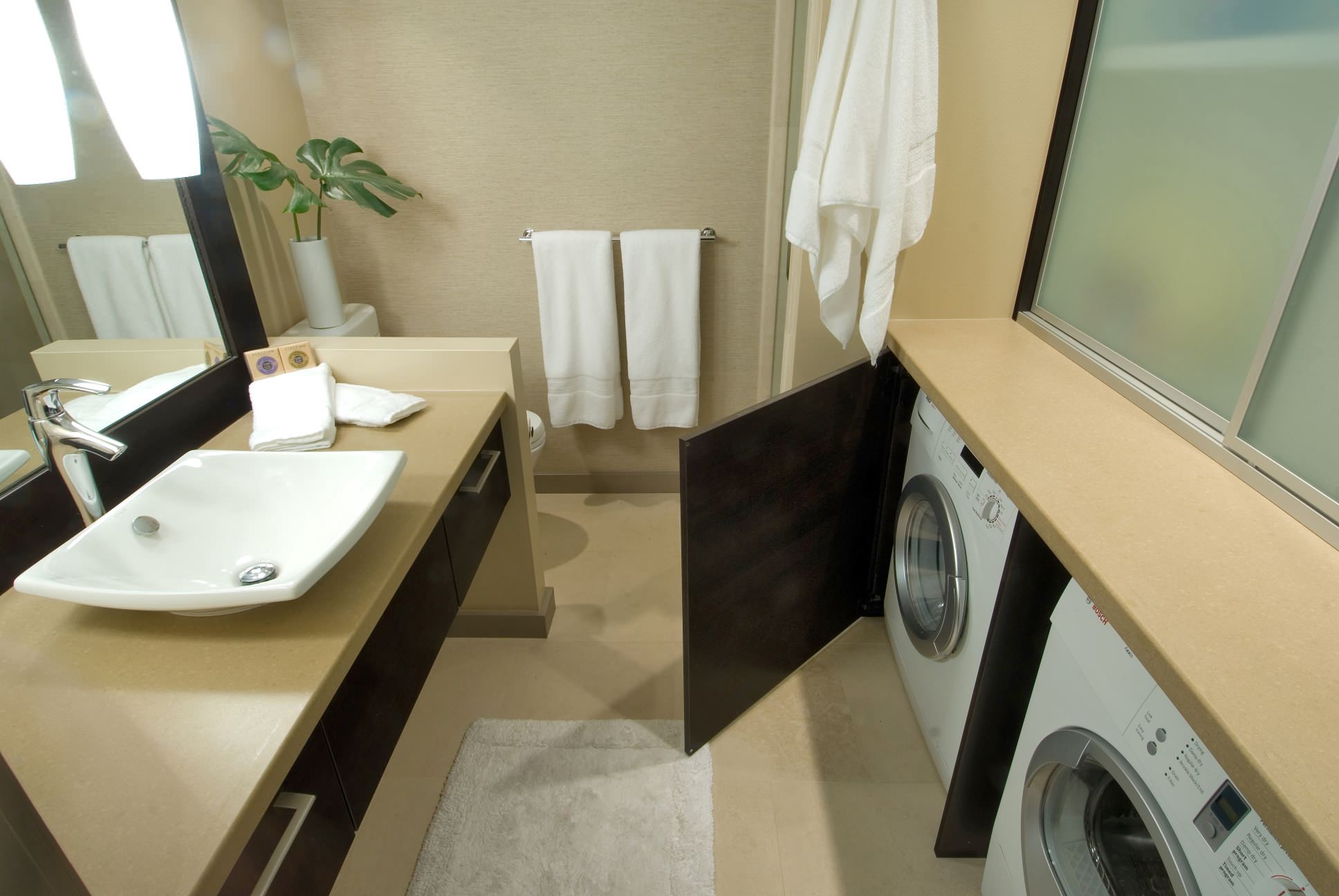 If you have the room, a washer and dryer in the bathroom will eliminate a lot of steps to keep towels and bath mats clean and fresh.