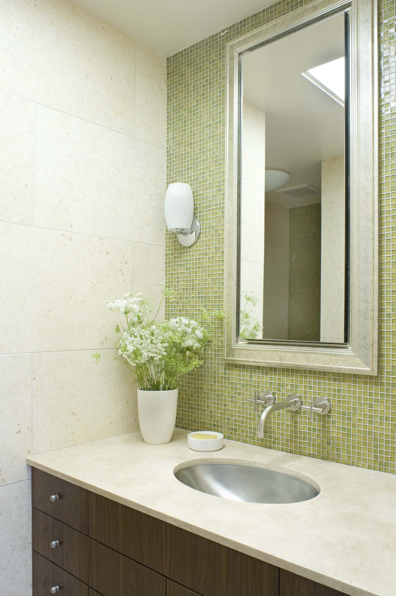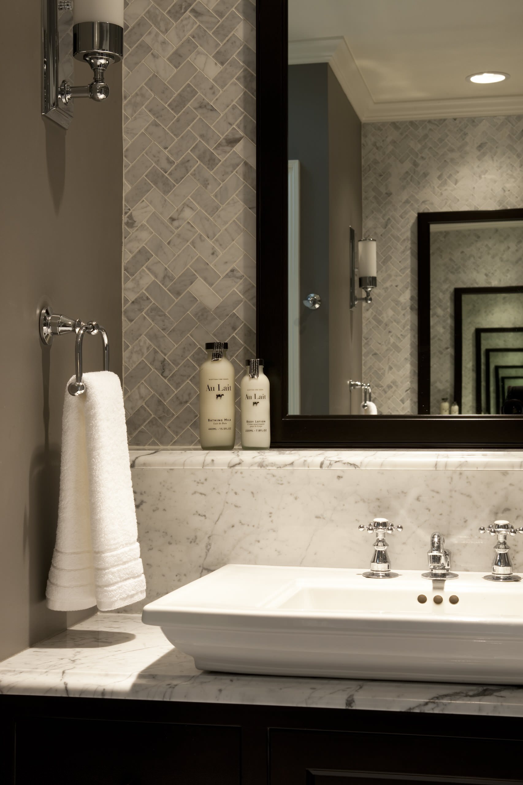 Choose tile placement carefully. I've been showing you lots of bathrooms that stay away from mosaic tile, but If you love the texture and the look, then place it where it will need the least amount of cleaning. This bathroom vanity uses solid marble slabs all around the business area of the bathroom, with the herringbone mosaic placed higher so it's out of the splash zone.