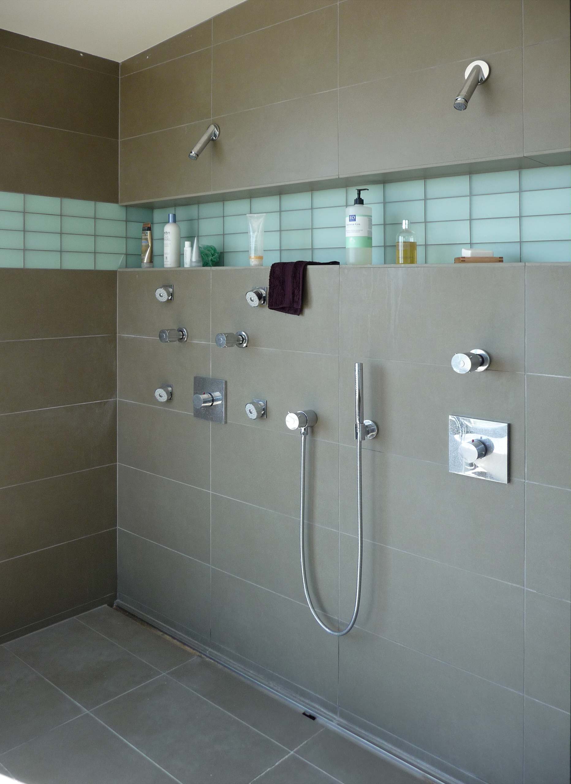 Select a linear drain. See that narrow channel at the base of the wall? That’s a linear drain. Installing one means that your shower floor will have a flat slope in one direction, so you can run your large-format floor tile right on into the shower instead of using little mosaic tiles to accommodate multiple directions of slope. It will set you back around $1,000, but ask yourself how much you hate cleaning grout.