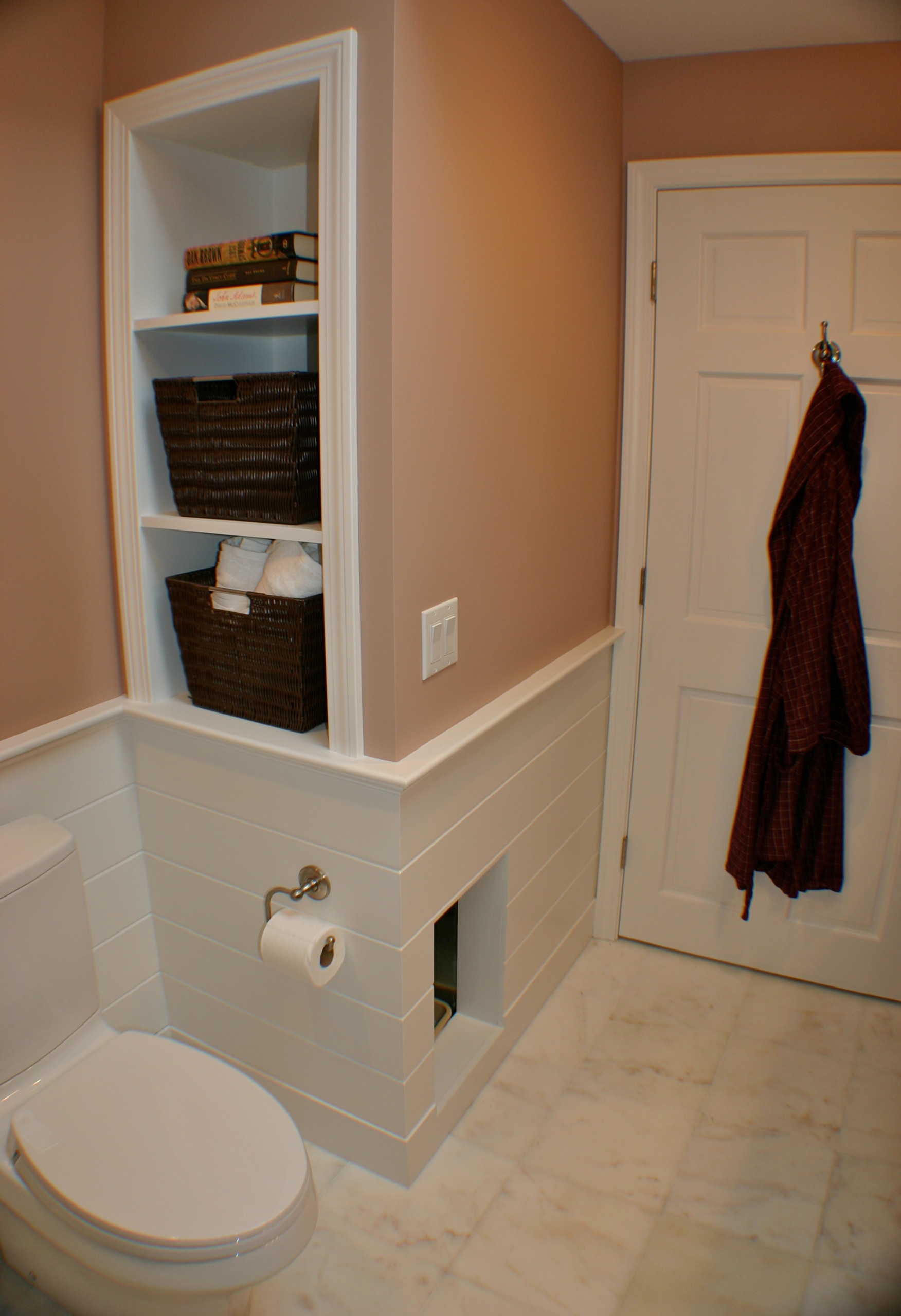 Do you share your bathroom with felines? Having a well-thought-out containment area for the litter will keep you from having to sweep up daily.