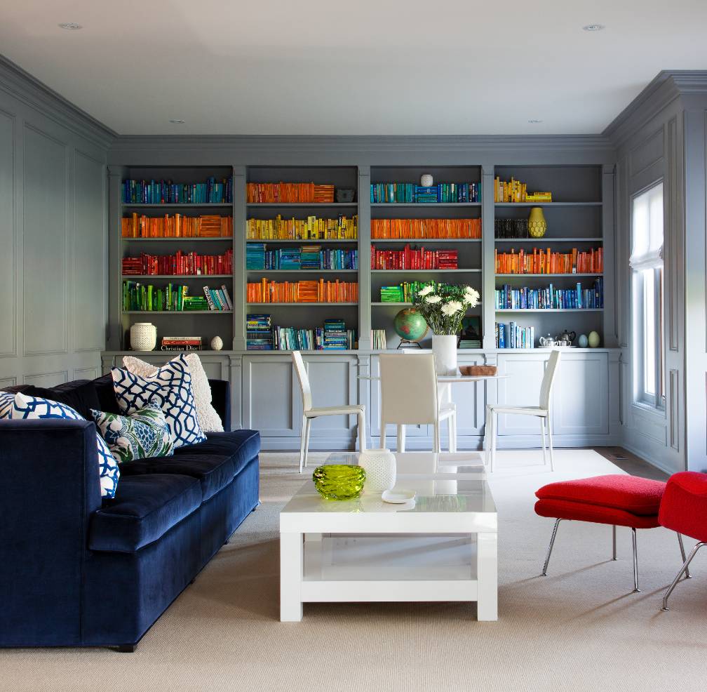 “When displaying intentionally by color, the books morph into chunks of red, green, blue, yellow and so on, and they no longer appear to be books. So why use books if color blocking is the goal? I think designers who sort books by color, and the client that allows this to happen, are missing the point of books. They need to look at other pieces to display, or forget about having bookshelves. Support your local artists instead.”