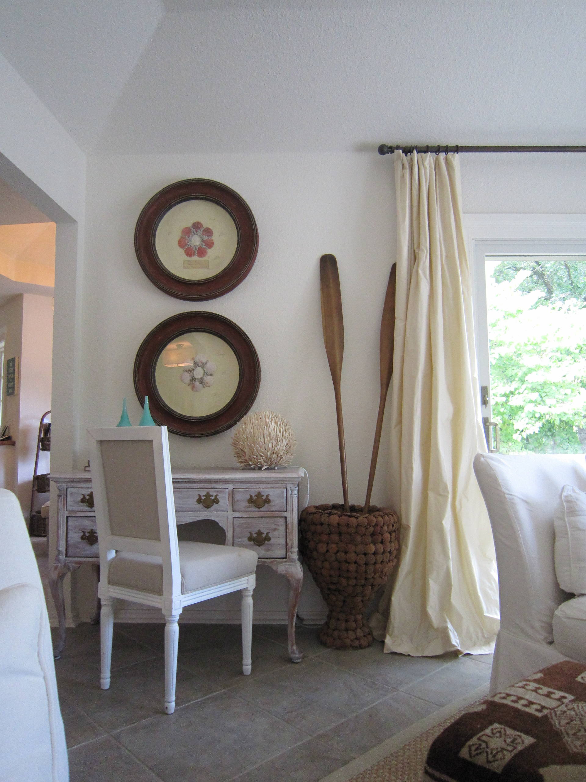Also play with art to bring nautical touches inside. In this photo, a swimmer is depicted in the painting above the fireplace. That one touch goes a long way.