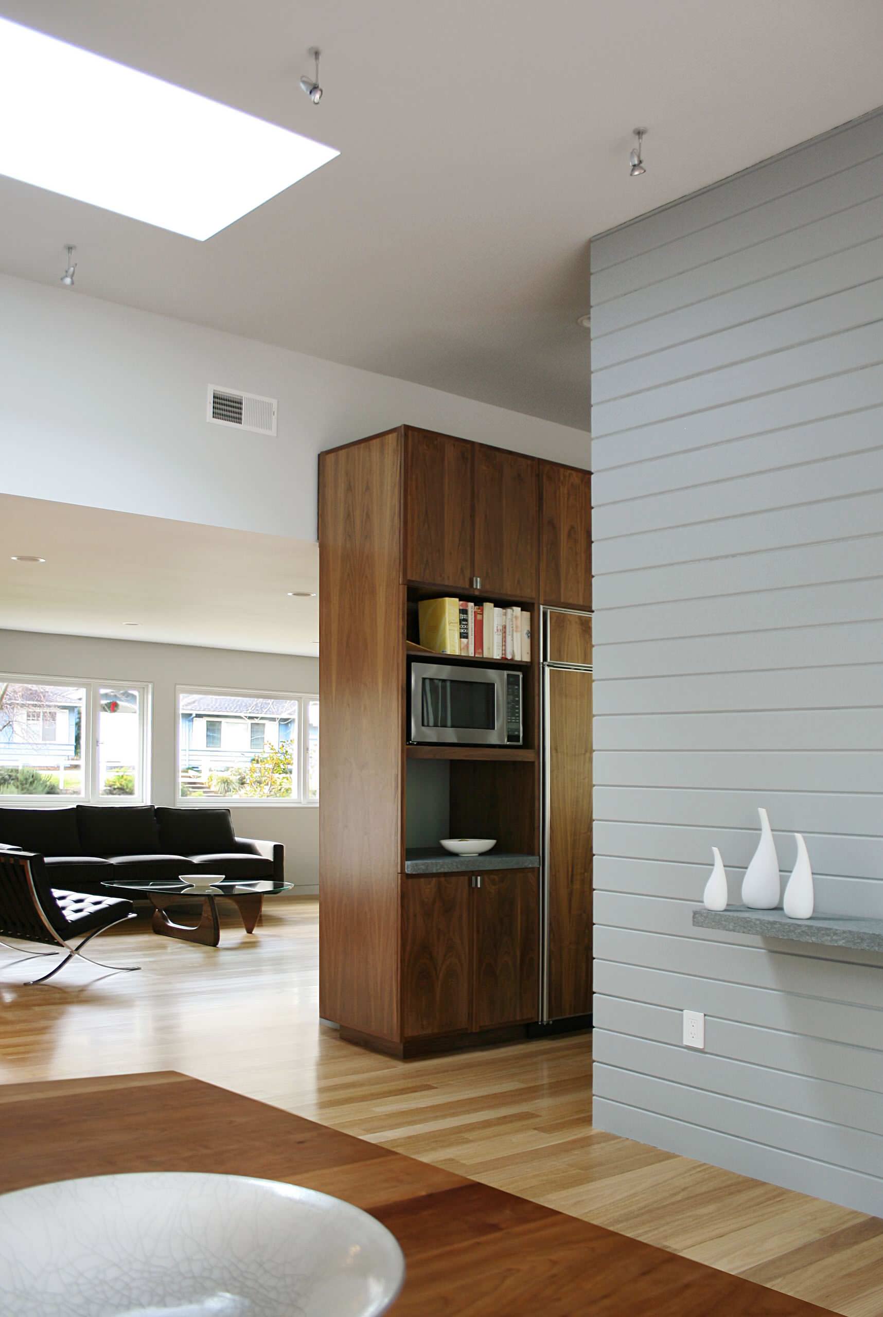 Tongue-and-groove plank installed on an entire wall can help delineate space within a space. If your lake house has floor-to-ceiling glass along the back, this is a great way to continue the architectural lines, using them to direct the eye out back. Consider dove gray over more obvious neutrals like beige or cream; it's soothing and works well with lake colors.