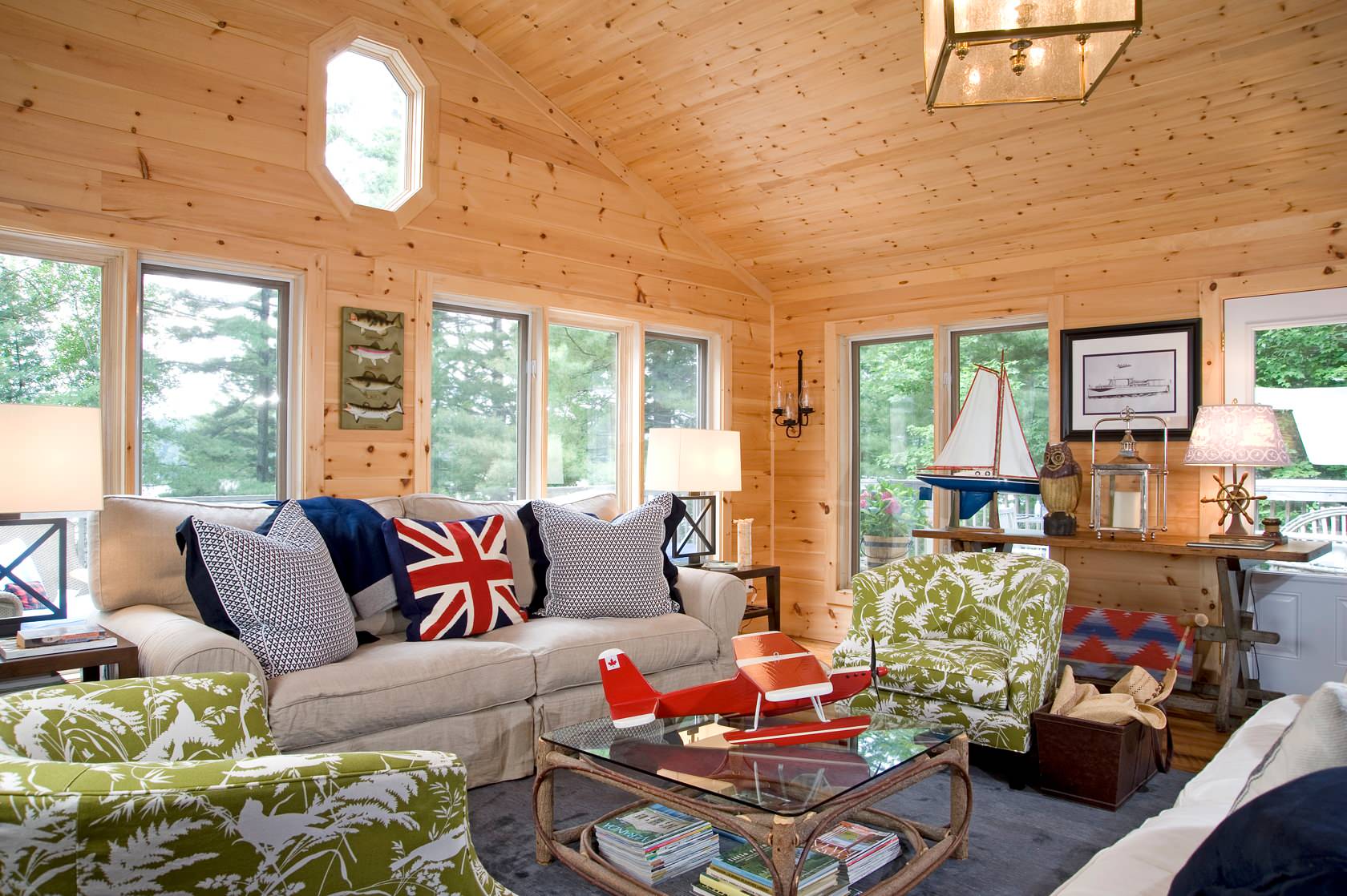 Glossy planks on the ceiling draw the eye up and emphasize a view, whether a lake or forest.