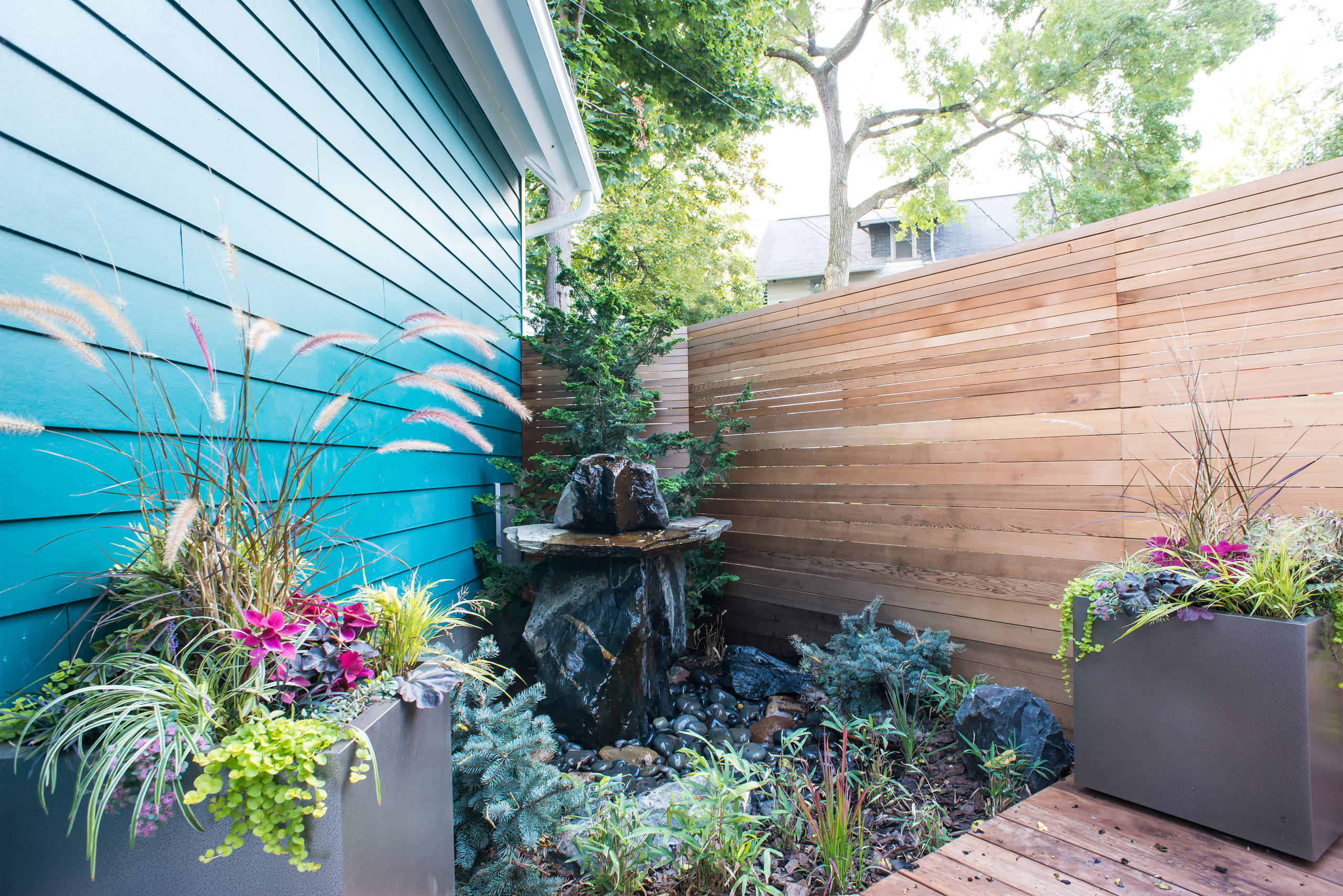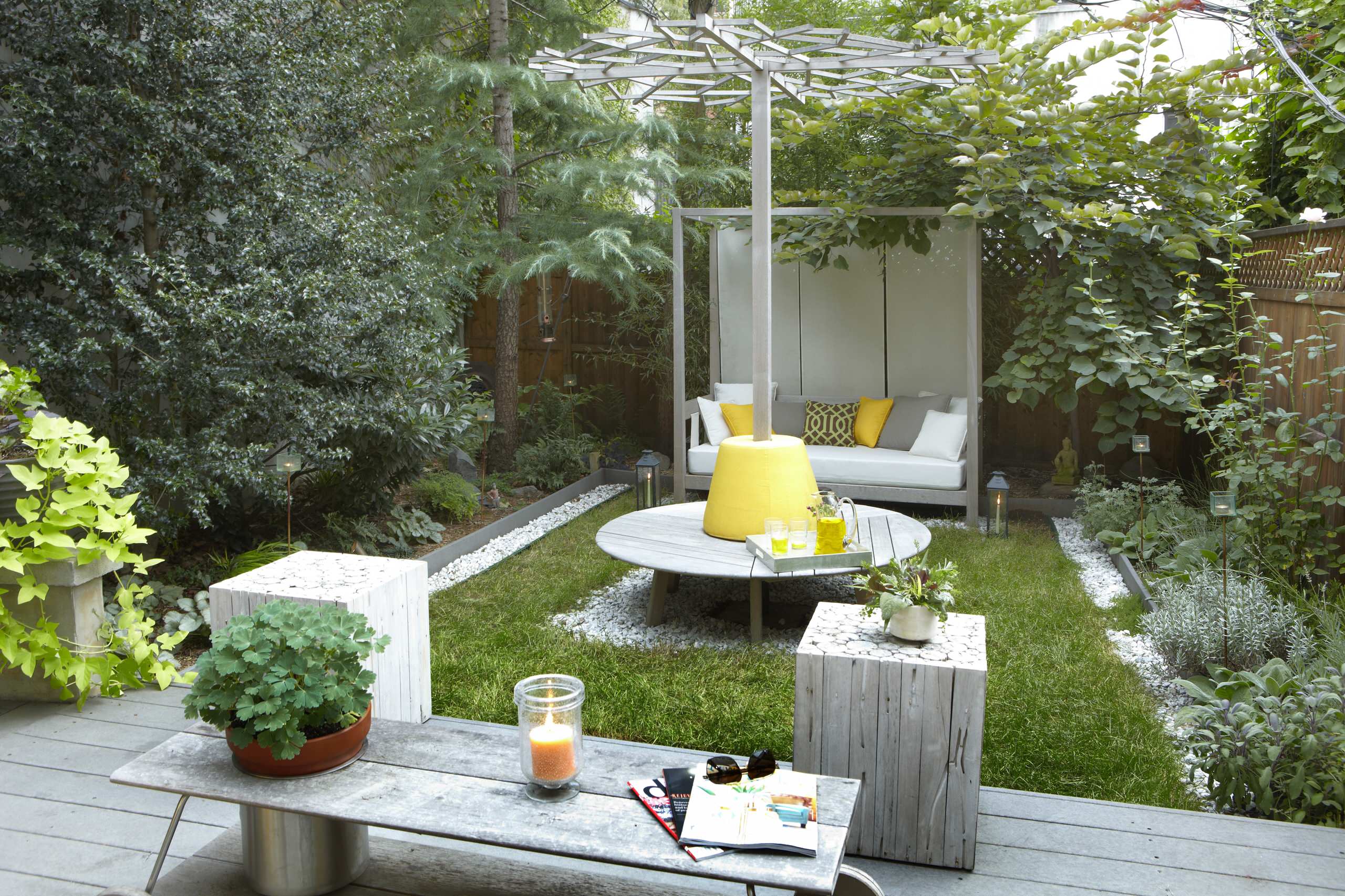 If you have a backyard that’s on the tight side, make the area appear larger than it really is by working in horizontal and vertical motifs. Here, square pavers are arranged in a stepped and linear pattern, and direct the eye to the back garden wall, creating the illusion of greater depth. Meanwhile, the ipe wood slatted wall draws the eye from one side of the garden to the other, which visually widens the area and amplifies the feeling of space.