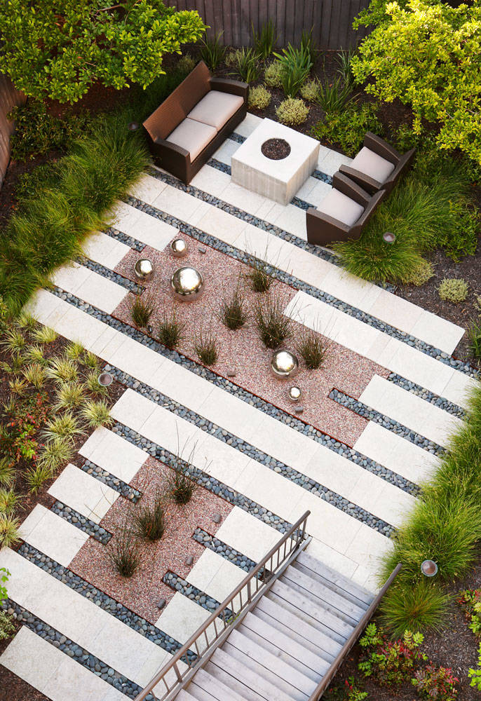 If you desire a more dynamic look, introduce a diagonal linear pattern into your compact backyard instead. Like horizontal and vertical lines, slanted stripes visually expand a space and add a sense of energy and a jolt of visual drama, too.