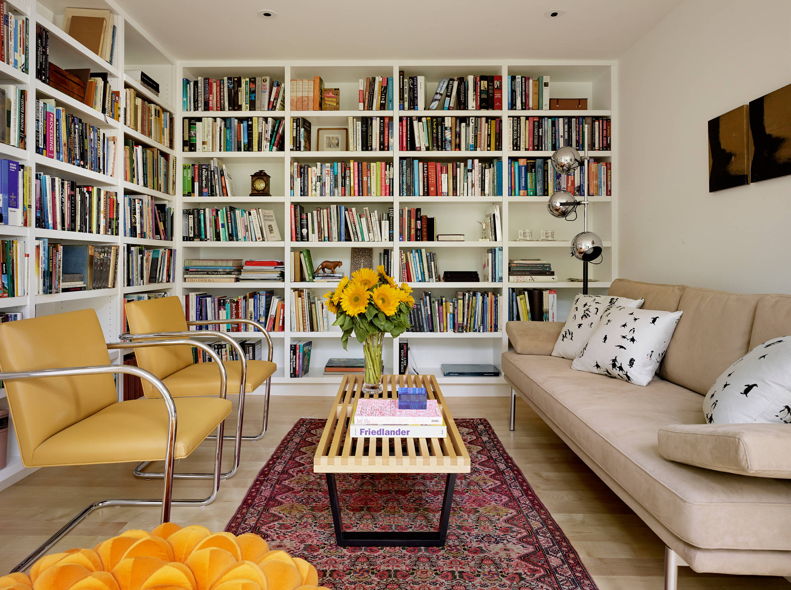 In the living room, the storage wall holds the media equipment. Objets d’art can be enjoyed from both sides.
