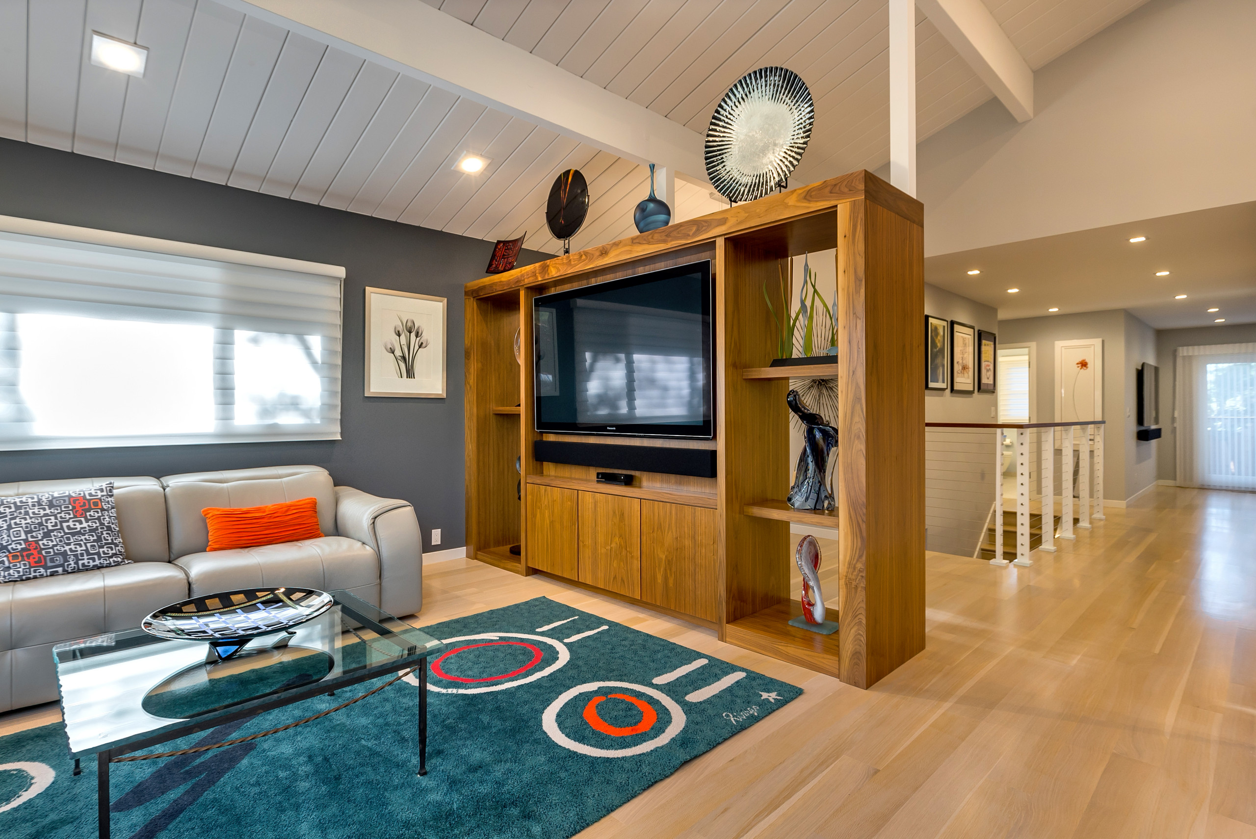 Ammirato Construction built this airier version of a storage wall for its gut remodel of a midcentury modern house in California. The open cubbies and shorter-than-ceiling height allow light to permeate the entry.