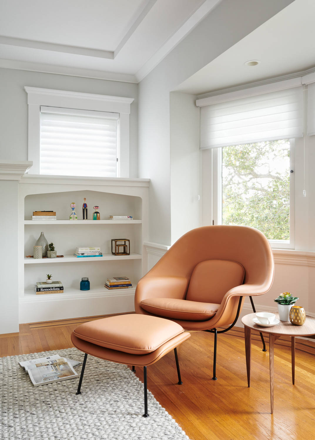 Claire Taylor Design paired the Womb chair with its matching ottoman in the living room of this remodeled California house.
