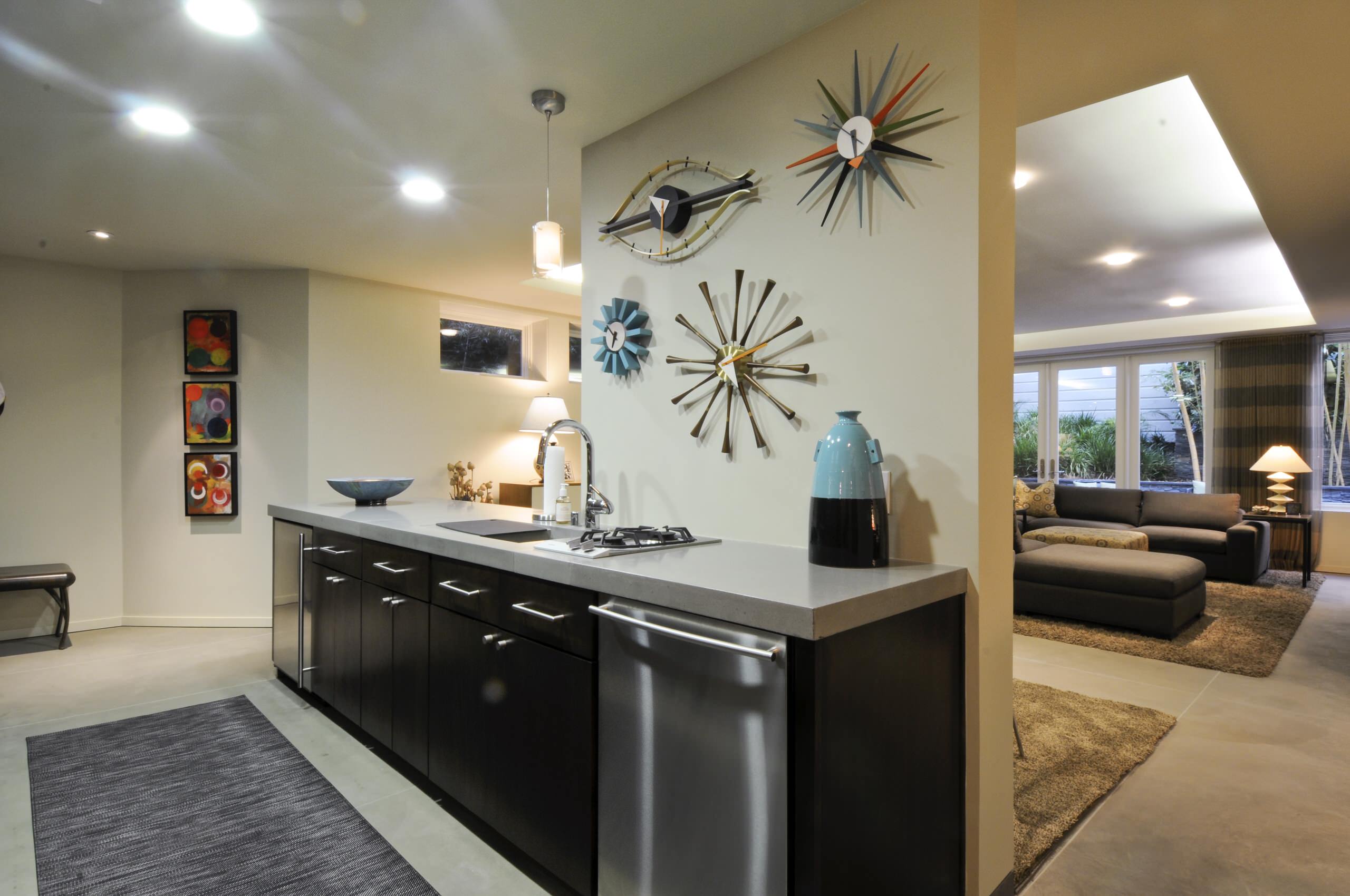 The room’s other family-friendly materials include Brazilian cherry flooring, soapstone counters, leather bar stools and Scotchgard-treated commercial upholstery. Sustainable features such as geothermal heating-cooling and photovoltaic solar panels make for a nearly net-zero energy-use home.