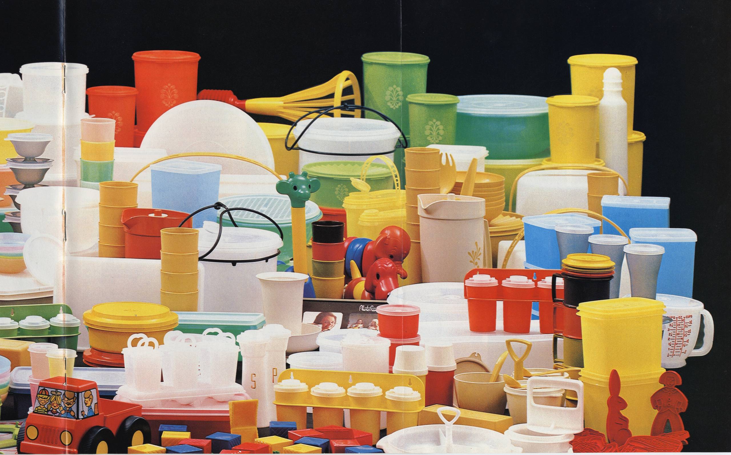 Ten years ago, MoMA revisited its Good Design initiatives of 1944-56. Alongside the Eameses’ molded plastic La Chaise were Earl Tupper’s molded plastic containers, pictured above in an old ad. The DuPont chemist figured out how to turn smelly polyethylene slag into prettily colored bowls and tumblers with airtight lids. Introduced in 1946 and sold via home-demonstration parties starting in 1948, Tupperware soon became another favorite tool in the household storage arsenal.