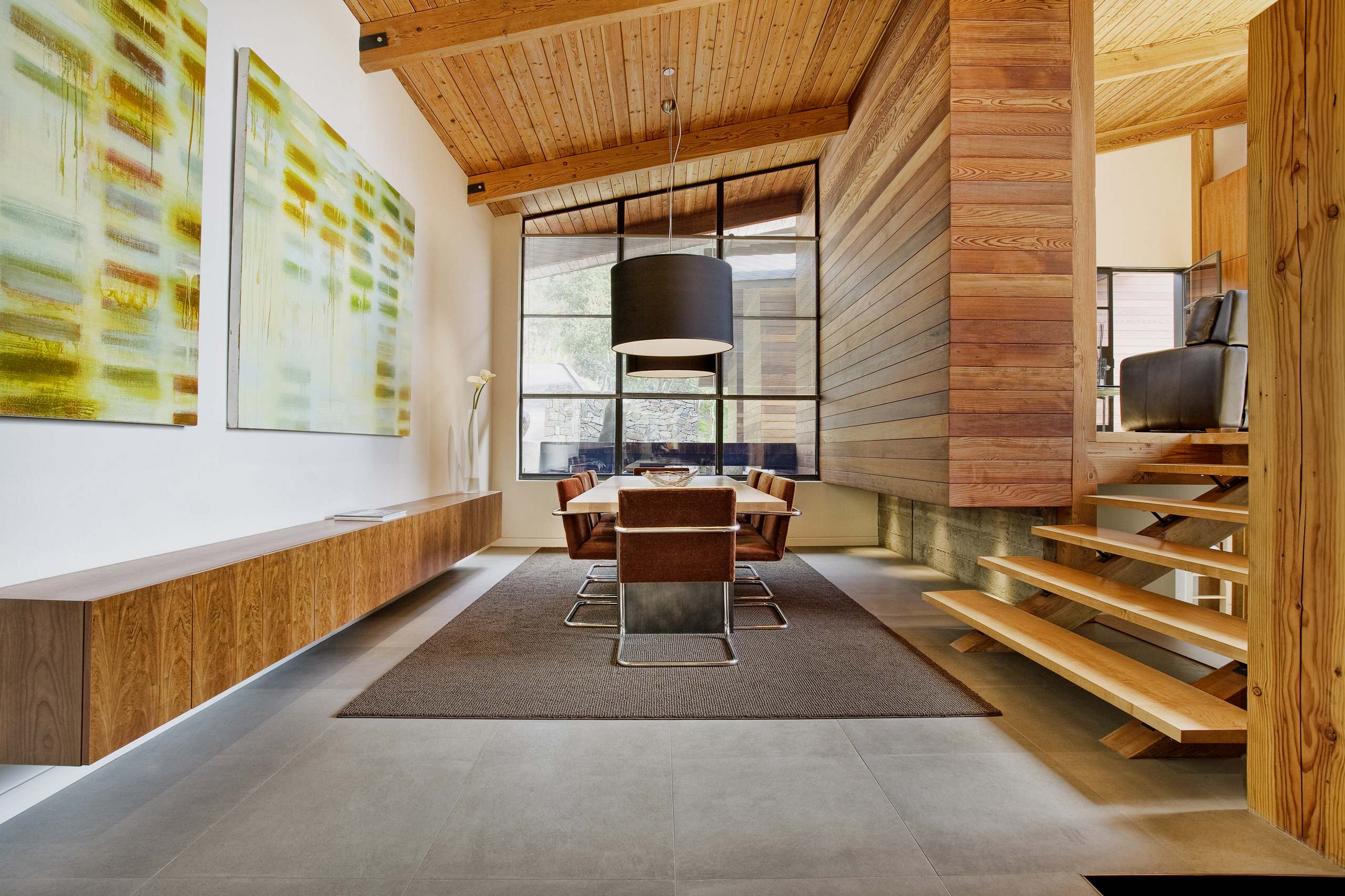 The lightness at the entry gives way to the solid anchoring wall of cabinetry at the living space. The thick wall connects the spaces of the home and explains clearly the priorities of each space. Plus, the cabinetry wall supports the design objective to defer to the monumental tree and view outside.